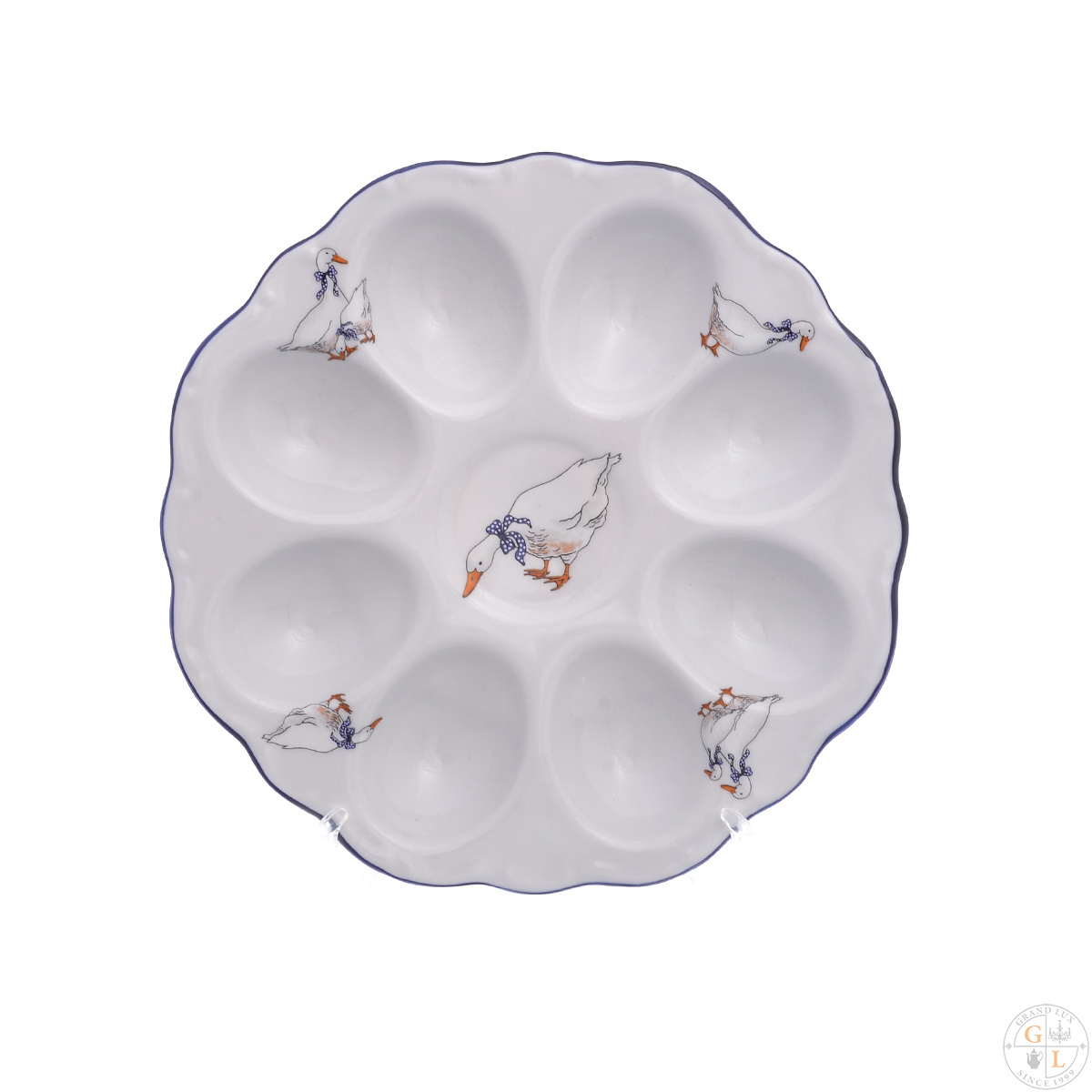 Поднос для яиц queens crown гуси 20см. Поднос для яиц Queens Crown Гуси 20см Такая «яичная» тарелка станет незаменимым аксессуаром на вашей кухне: в ней можно красиво поставить на стол крашенки, сервировать половинки фаршированных яиц, удивив гостей необычным подходом к подаче и сервировке оригинальных блюд. Изделие не боится частого мытья и интенсивного использования, глазурованное покрытие обеспечивает фигурному блюду привлекательный блеск и защищает рисунок от стирания. Тип товара салфетки-подставки (Чехия, Фарфор, Queens Crown) Страна происхождения Чехия Материал Фарфор Бренд Queens Crown Серия Гуси Корона Назначение Предмет домашнего обихода из фарфора