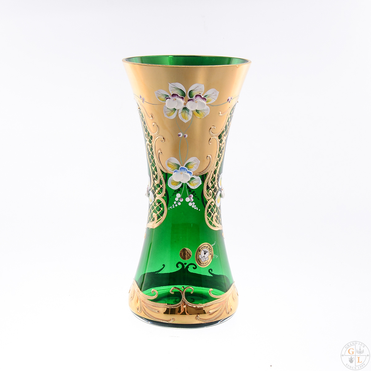 Ваза для цветов bohemia лепка зелёная 22см. Ваза для цветов Bohemia Лепка зелёная 22см Ваза-иксовка в цвете изумруда с золотой отделкой – это хит продаж. Вазами данного типа можно декорировать празднично сервированный стол, что придаст ему еще более торжественный и презентабельный вид. Изделие произведено из хрустального стекла, декорировано позолотой и элементами ручной лепки. Благодаря высокому качеству, очаровательная вазочка будет долго радовать вас своей красотой и практичностью. Тип товара вазы (Чехия, Стекло, Star Crystal) Страна происхождения Чехия Материал Стекло Бренд Star Crystal Серия Star Crystal Назначение Предмет домашнего обихода из стекла Длина/Ширина/Высота, см 11/11/22