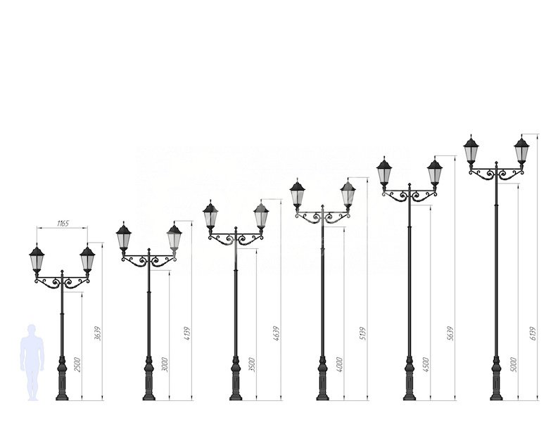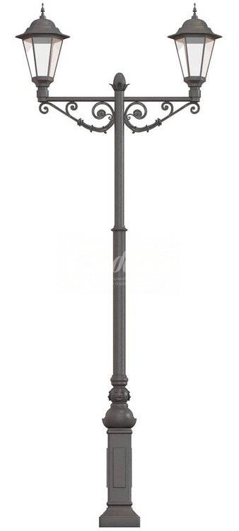 Фонарный столб с-06-2 со светильниками. Подробные характеристики Материалы: Основание и кронштейн: Чугунное художественное литьё. Покрыты порошковой полимерной краской. Возможность выбора цвета по каталогу RAL. Стандартный цвет (по умолчанию) - черный + бронзовое патинирование. Стойка: Сталь. Покрыта порошковой полимерной краской. Возможность выбора цвета по каталогу. Стандартный цвет (по умолчанию) - черный + бронзовое патинирование. Светильник: Бремен. Технические характеристики: Источник света: Патрон E-27 под лампу накаливания до 150 Вт, либо энергосберегающую лампу. Возможна комплектация ПРА под Nat70, Nat100, ДРЛ80, ДРЛ125 и источником света. Возможно комплектование светодиодными модулями. Высота: от 3,639 до 5,639 м Вес: от 108 кг Установка производится путем бетонирования стойки (закладного фундамента), либо бетонированием закладной детали с последующим креплением стойки болтовым соединением. Закладной фундамент заказывается отдельно и в цену не входит. О модели Используется для освещения парков, скверов, коттеджных поселков, частных домов, прилегающих территорий зданий. Установка производится путем бетонирования стойки (закладного фундамента), либо бетонированием закладной детали с последующим креплением стойки болтовым соединением. Благоустройство нового Арбата в Шымкенте, Казахстан
