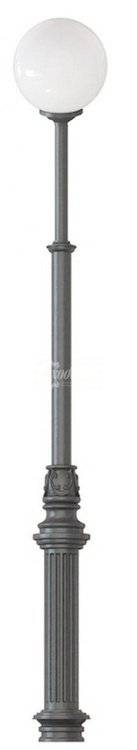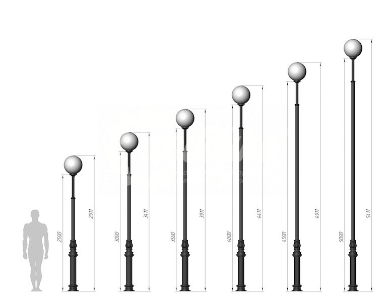 Фонарный столб а-03 со светильником. Подробные характеристики Материалы: Основание и кронштейн: Чугунное художественное литьё. Покрыты порошковой полимерной краской. Возможность выбора цвета по каталогу RAL. Стандартный цвет (по умолчанию) - черный + бронзовое патинирование. Стойка: Сталь. Покрыта порошковой полимерной краской. Возможность выбора цвета по каталогу. Стандартный цвет (по умолчанию) - черный + бронзовое патинирование. Светильник: Шар 400 мм. Технические характеристики: Источник света: Патрон E-27 под лампу накаливания до 150 Вт, либо энергосберегающую лампу. Возможна комплектация ПРА под Nat70, Nat100, ДРЛ80, ДРЛ125 и источником света. Возможно комплектование светодиодными модулями. Высота: от 2,911 до 5,411 м Вес: от 84 кг Установка производится путем бетонирования стойки (закладного фундамента), либо бетонированием закладной детали с последующим креплением стойки болтовым соединением. Закладной фундамент заказывается отдельно и в цену не входит. О модели Используется для освещения парков, скверов, коттеджных поселков, частных домов, прилегающих территорий зданий. Установка производится путем бетонирования стойки (закладного фундамента), либо бетонированием закладной детали с последующим креплением стойки болтовым соединением.