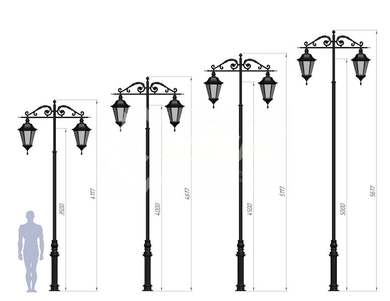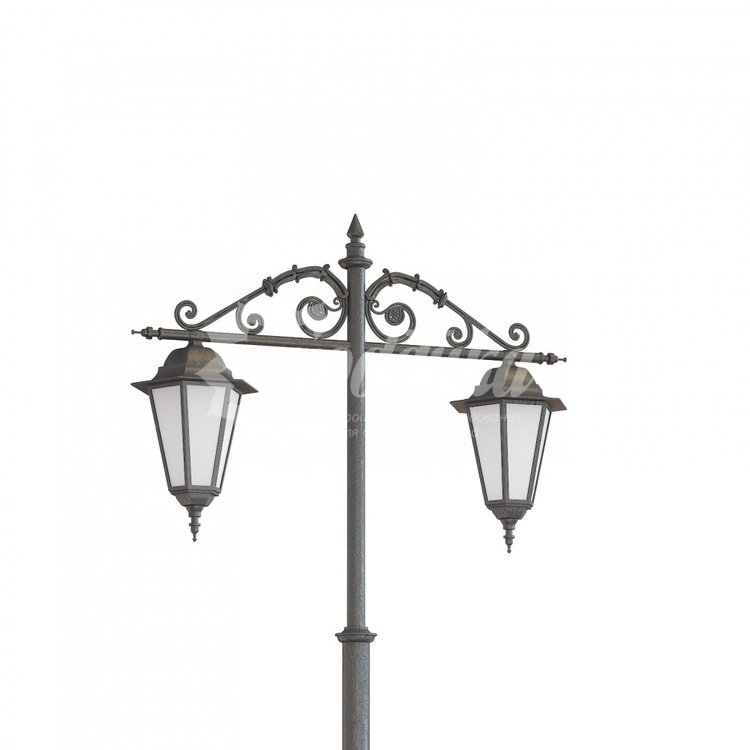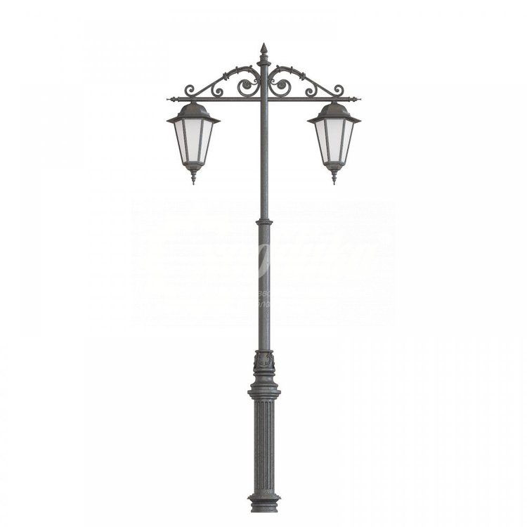 Фонарный столб а-02-2 со светильниками. Подробные характеристики Материалы: Основание и кронштейн: Чугунное художественное литьё. Покрыты порошковой полимерной краской. Возможность выбора цвета по каталогу RAL. Стандартный цвет (по умолчанию) - черный + бронзовое патинирование. Стойка: Сталь. Покрыта порошковой полимерной краской. Возможность выбора цвета по каталогу. Стандартный цвет (по умолчанию) - черный + бронзовое патинирование. Светильник: Бремен. Технические характеристики: Источник света: Патрон E-27 под лампу накаливания до 150 Вт, либо энергосберегающую лампу. Возможна комплектация ПРА под Nat70, Nat100, ДРЛ80, ДРЛ125 и источником света. Возможно комплектование светодиодными модулями. Высота: от 4,117 до 5,617 м Вес: от 96 кг Установка производится путем бетонирования стойки (закладного фундамента), либо бетонированием закладной детали с последующим креплением стойки болтовым соединением. Закладной фундамент заказывается отдельно и в цену не входит. О модели Используется для освещения парков, скверов, коттеджных поселков, частных домов, прилегающих территорий зданий. Установка производится путем бетонирования стойки (закладного фундамента), либо бетонированием закладной детали с последующим креплением стойки болтовым соединением.