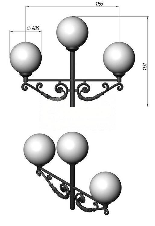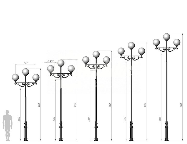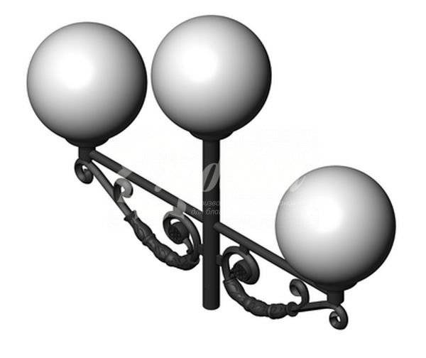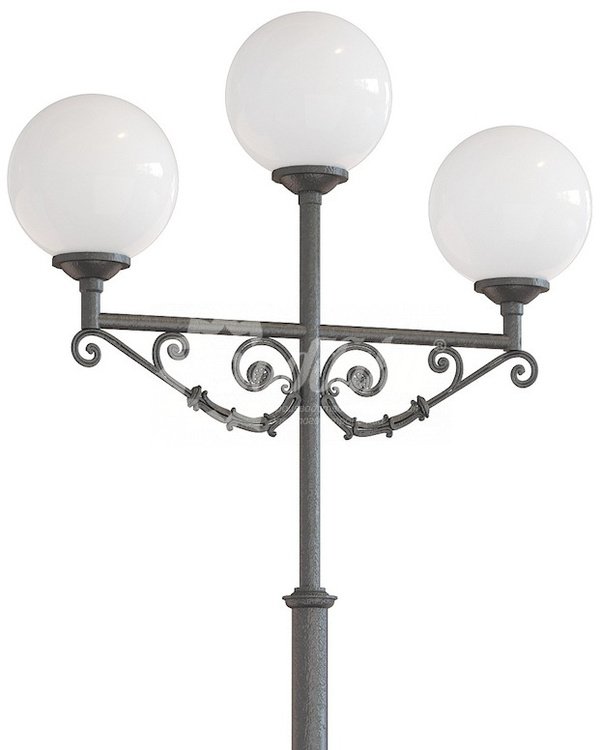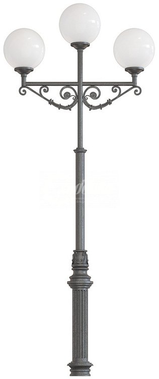 Фонарный столб а-12-3 со светильниками. Подробные характеристики Материалы: Основание и кронштейн: Чугунное художественное литьё. Покрыты порошковой полимерной краской. Возможность выбора цвета по каталогу RAL. Стандартный цвет (по умолчанию) - черный + бронзовое патинирование. Стойка: Сталь. Покрыта порошковой полимерной краской. Возможность выбора цвета по каталогу. Стандартный цвет (по умолчанию) - черный + бронзовое патинирование. Светильник: Шар 400 мм. Технические характеристики: Источник света: Патрон E-27 под лампу накаливания до 150 Вт, либо энергосберегающую лампу. Возможна комплектация ПРА под Nat70, Nat100, ДРЛ80, ДРЛ125 и источником света. Возможно комплектование светодиодными модулями. Высота: от 4,131 до 5,631 м Вес: от 97 кг Установка производится путем бетонирования стойки (закладного фундамента), либо бетонированием закладной детали с последующим креплением стойки болтовым соединением. Закладной фундамент заказывается отдельно и в цену не входит. О модели Используется для освещения парков, скверов, коттеджных поселков, частных домов, прилегающих территорий зданий. Установка производится путем бетонирования стойки (закладного фундамента), либо бетонированием закладной детали с последующим креплением стойки болтовым соединением.