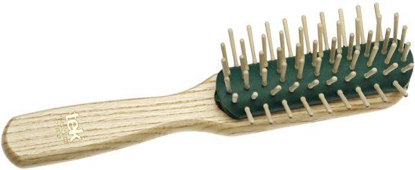 Щётка маленькая разборная из натуральной древесины ясеня с деревянными зубцами Baseball, форма зубцов (узкие внизу, широкие вверху) позволяет расчёсывать как длинные, так и короткие, как гладкие, так и волнистые волосы. Закруглённые кончики массируют кожу головы. Каучуковая подушечка у этой щётки снимается с ручки (для мытья щётки, ручки и подушечки отдельно и для облегчения замены зубцов). Резиновая подушечка легко прогибается для лучшего результата при расчёсывании и укладке волос. Размер около 17 см (подходит для дамской сумочки).