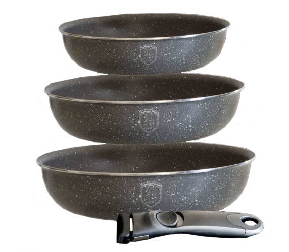 Сковороды набор bh-1479 5пр.мрам.покр.3сковор.+ручка. Набор сковород со съемной ручкой, штамп. алюминий, мраморное покрытие, включают в себя: сковорода 20х5 см 1,2 л, сковорода 24x5 см, 1,7 л, сковорода 28x5,5 см 2,7 л, 1 шт съемная ручка #40;подходит для всех #41;, цвет: серый, упаковка: цв.кор.  развернуть описание ▼