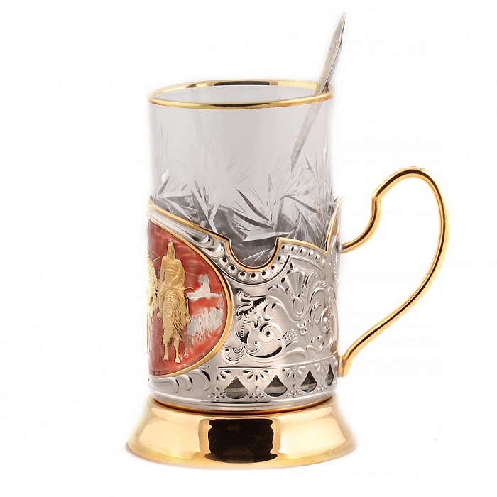 Подстаканник с позолотой с эмалью три богатыря в деревянном футляре