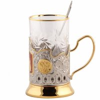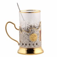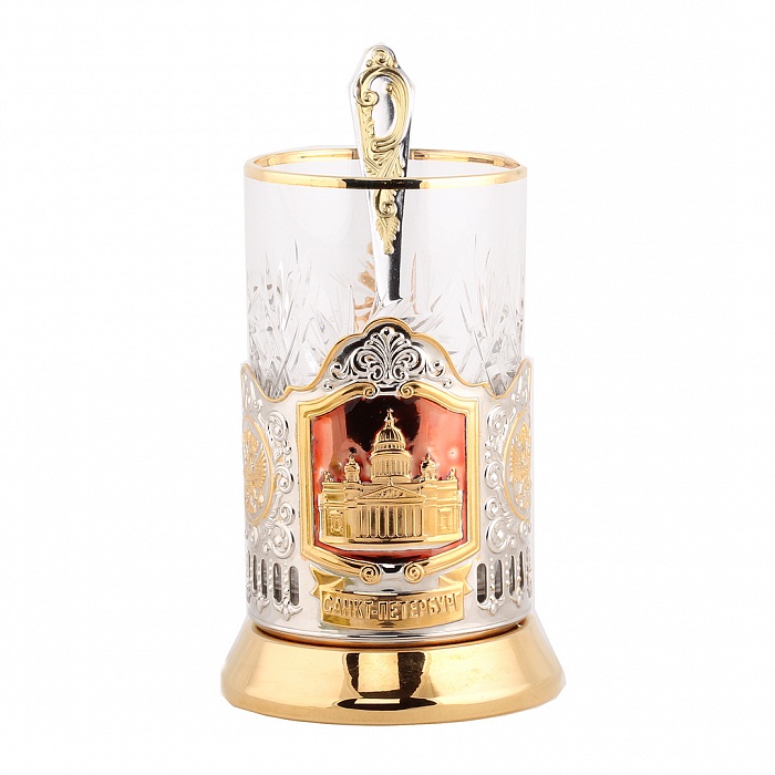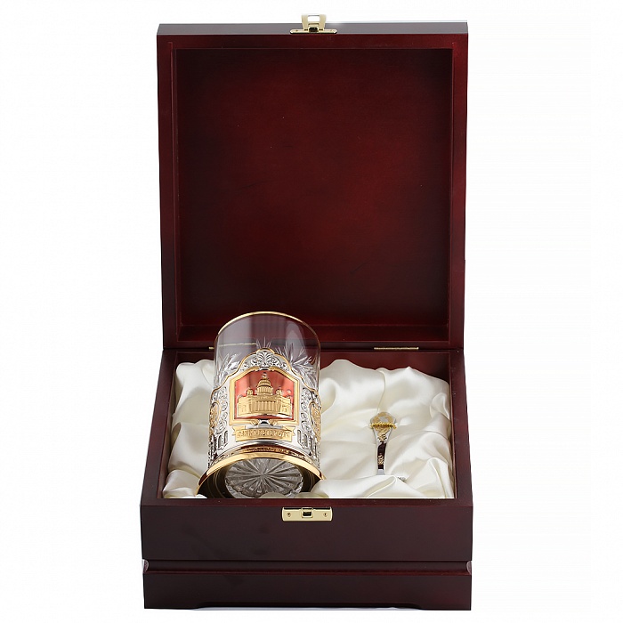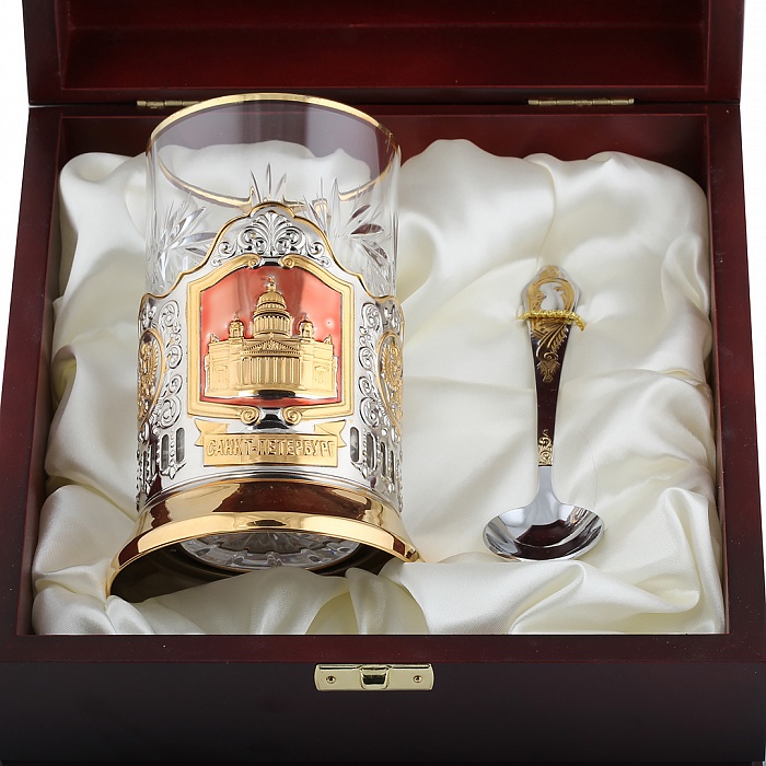 Подстаканник с позолотой с эмалью исакиевский собор в деревянном футляре