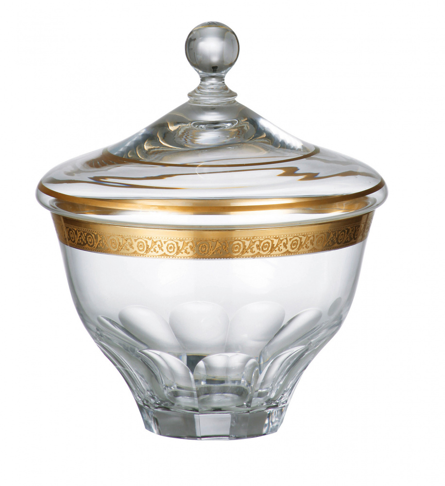 Ваза для конфет 20см джесси. Описание: 1100гр 180х180х208мм Страна: Чехия Бренд: Kvetna Коллекция: Джесси Материал: Стекло Вес: 1.797кг Цвет: Золотой