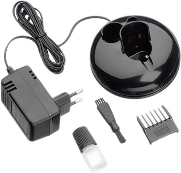 . - Зарядная подставка. - Энергосберегающий сетевой адаптер. - Щеточка для чистки. - Масло для ухода за ножевым блоком.