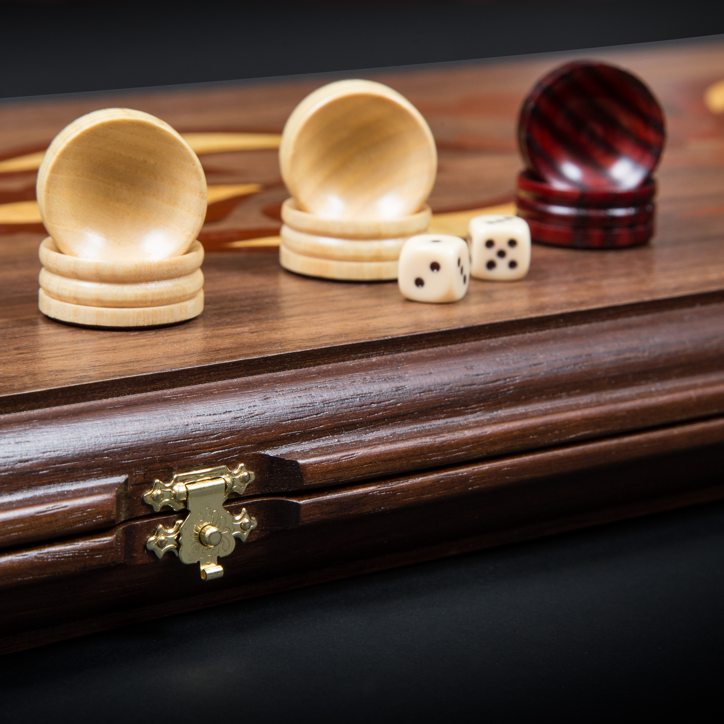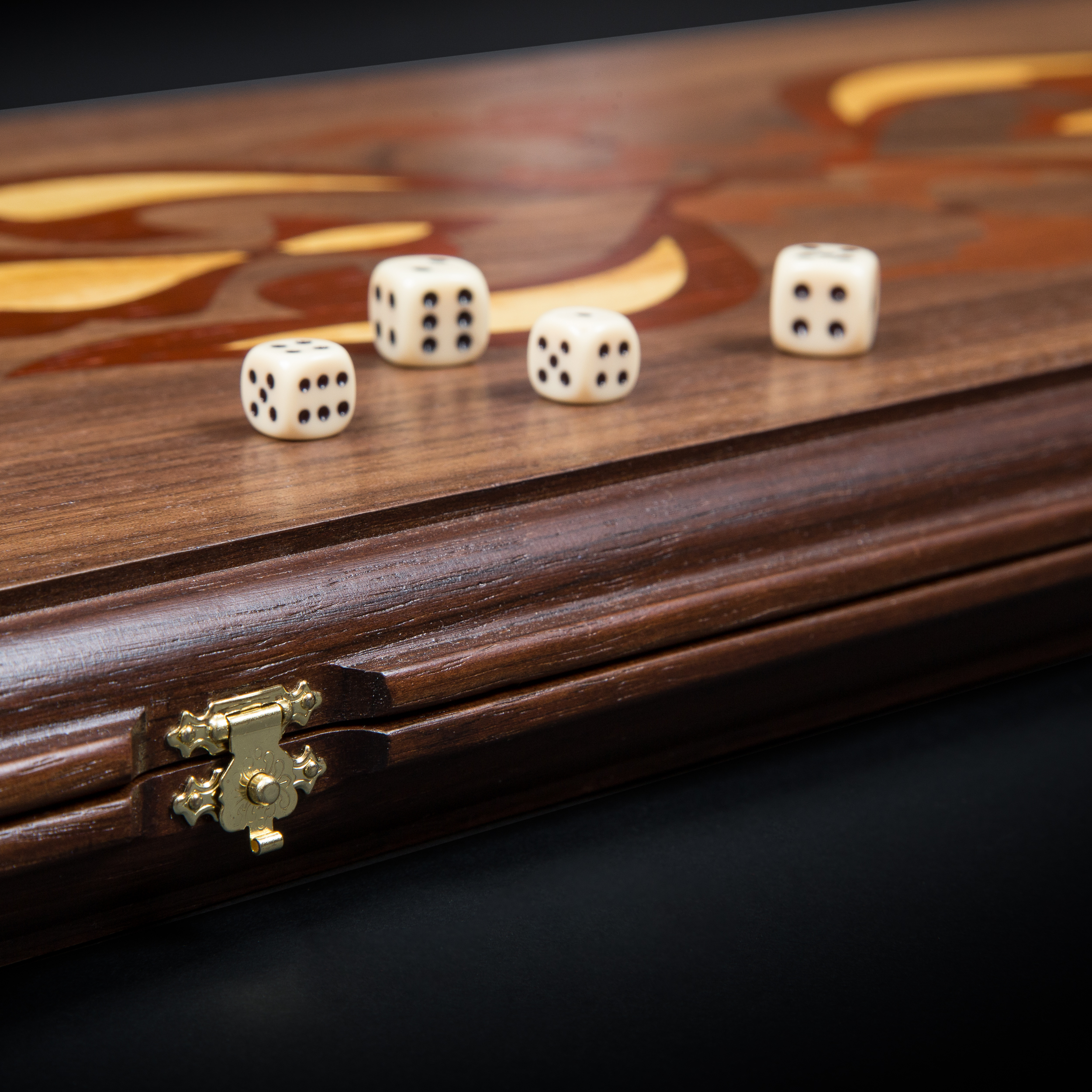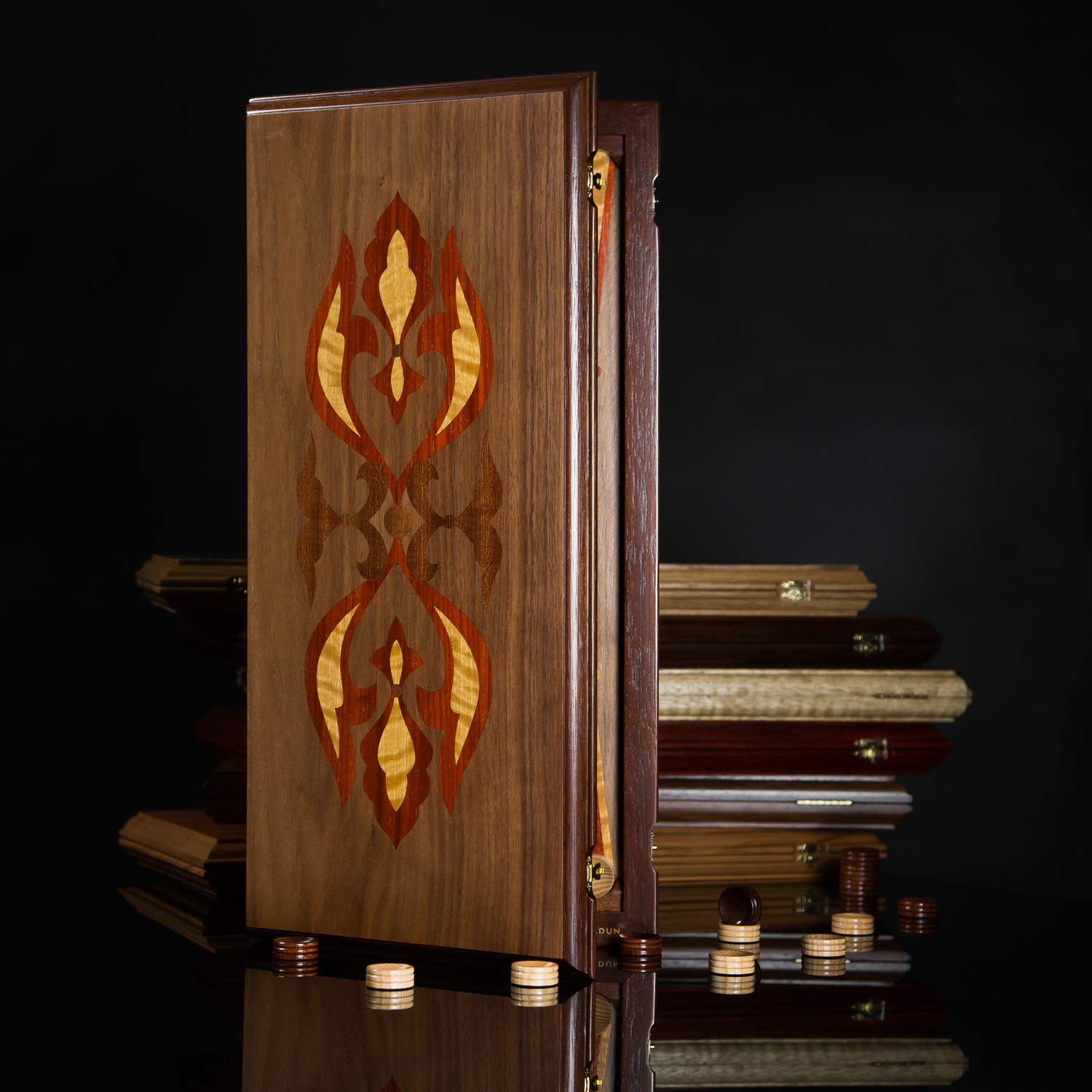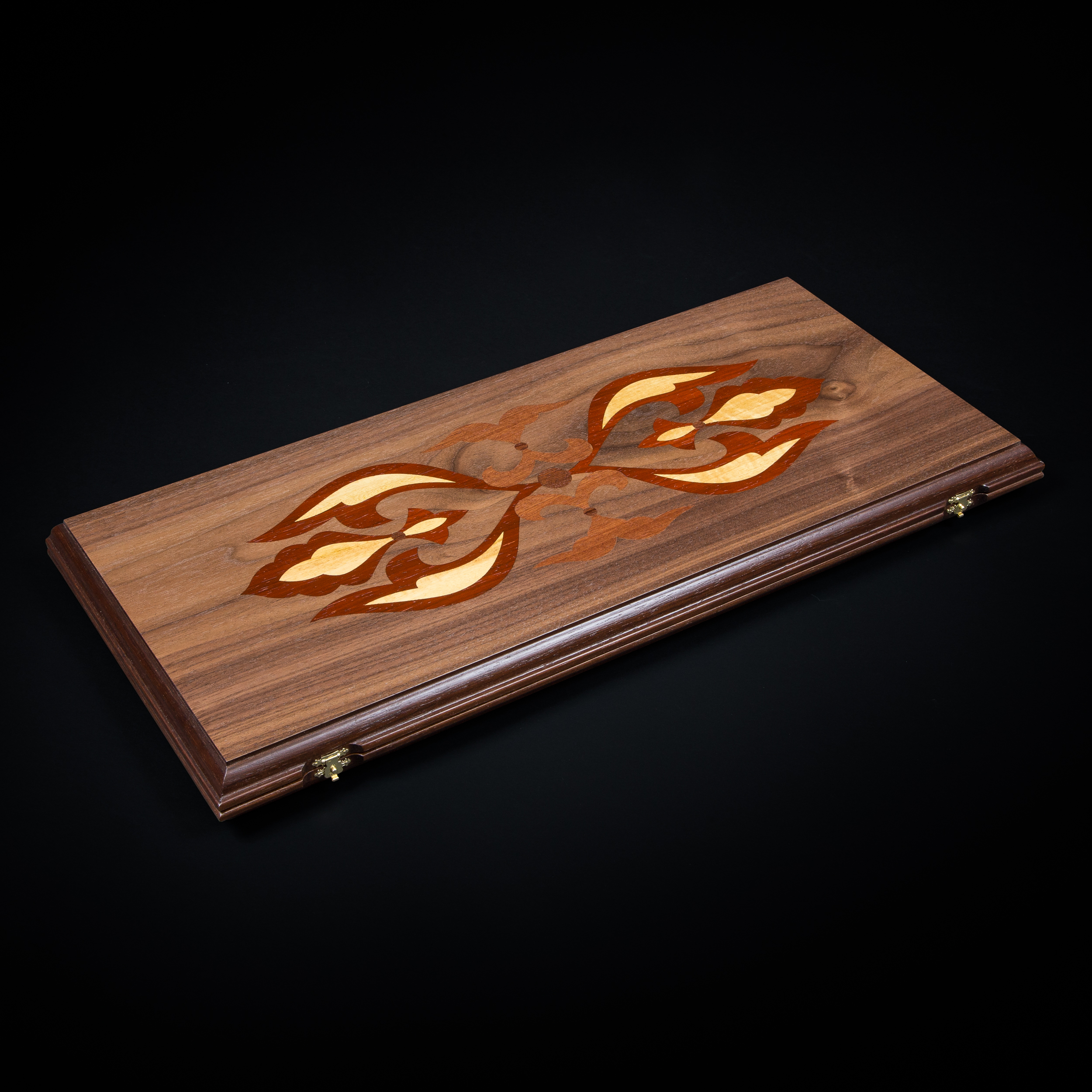 Нарды саламандра элит из ореха kadun. корпус - американский орех, шелковисто-матовый лак, рисунок в технике маркетри( мозаика ) лицевая сторона – американский орех, лимонное дерево, венге, сапеле игровое поле внутри - падук, лимонное дерево, американский орех шашки светлые - ясень, темные - ясень тонированный, подклеены замшем. кубики - арамит Размеры в сложенном виде длина 54см ширина 24см в раскрытом виде длина 54см ширина 48см шашки ручной работы диаметром 27мм 30шт кубики грань 12мм 2шт