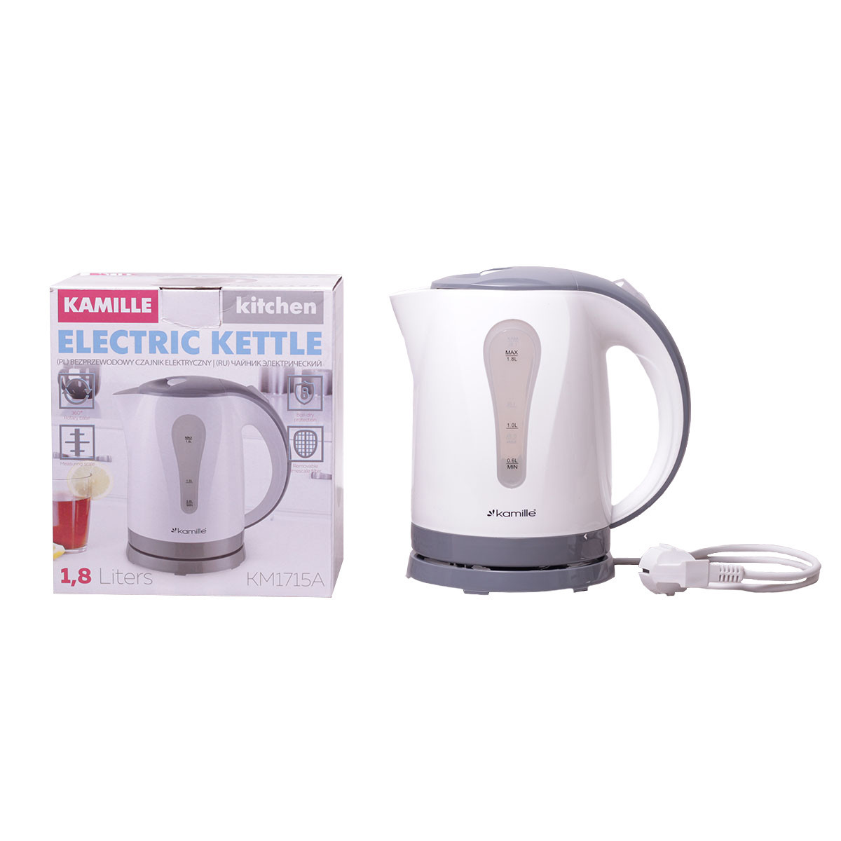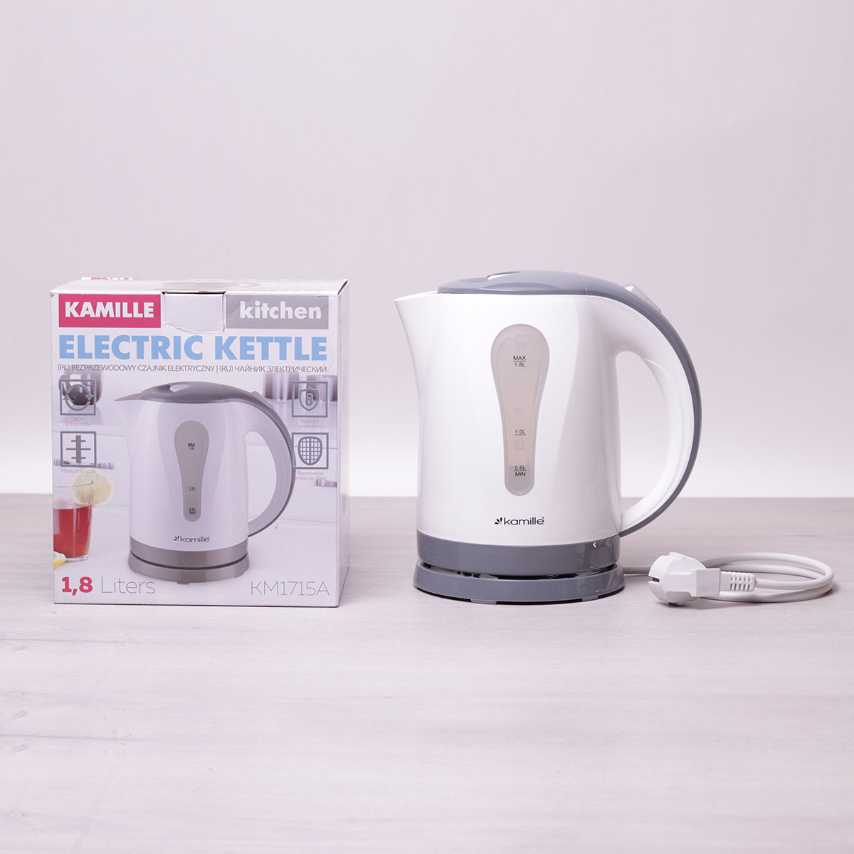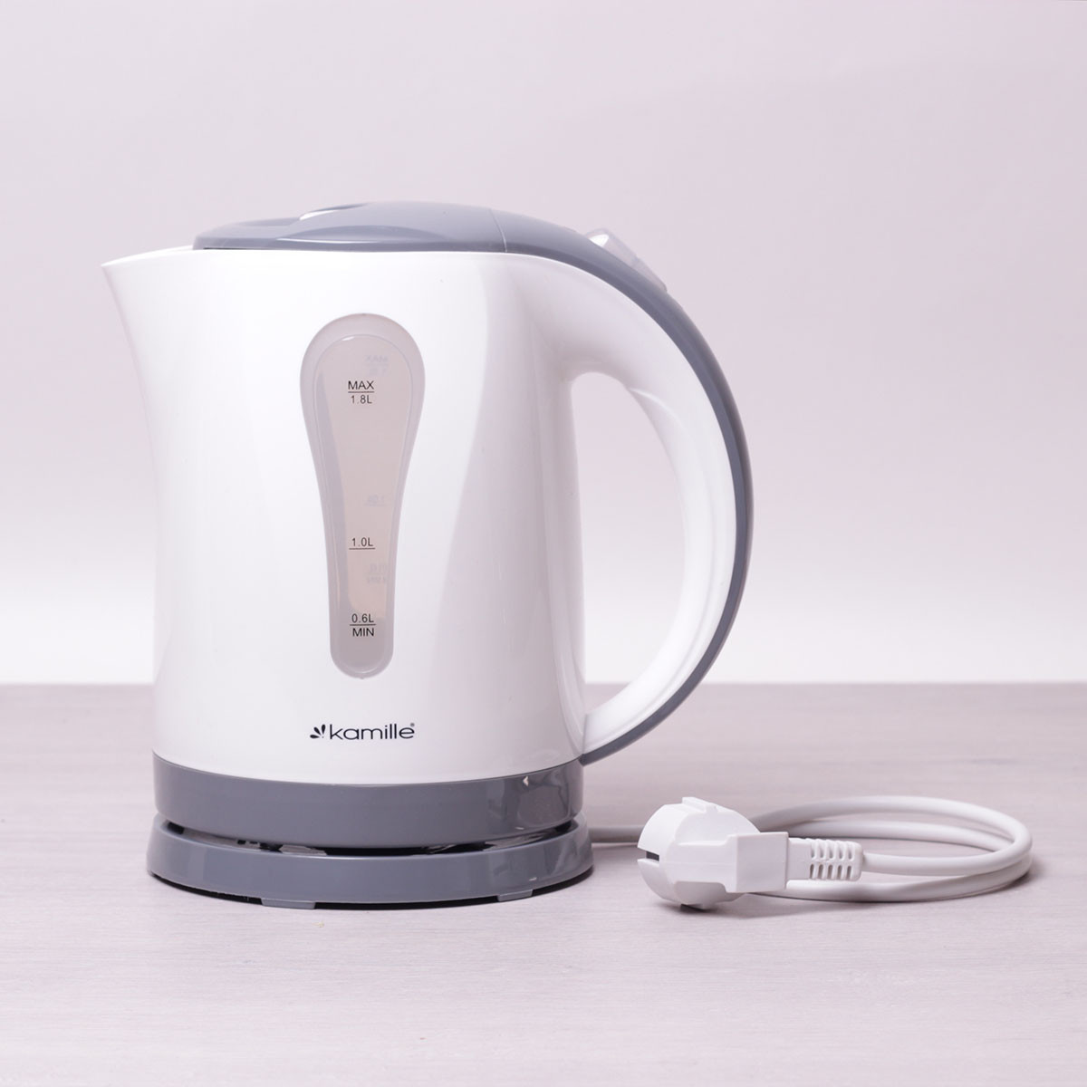 Чайник электрический kamille 1.8л пластиковый (белый с серым). Бренд: Kamille Описание: Электрические чайники Kamille изготовлены из высококачественных материалов с использованием новейших технологий производства, благодаря чему они подходят для интенсивного ежедневного использования, а их эстетичный внешний вид непременно подойдет к дизайну Вашей кухни. Напряжение: 220-240V Питание: 50/60Hz 1850-2200W Материал: пластик, нержавеющая сталь Материал ручки: бакелит Объем: 1.8л Цвет: белый с серым Особенности: стильный современный дизайн корпус из качественного пластика, прочный и устойчивый к загрязнению. автоматическая кнопка выключения. тип ручки: фиксированная. скрытый нагревательный элемент из нержавеющей стали поворотное основание на 360 градусов Уход: Перед использованием необходимо промыть и прокипятить изделие. Во избежание опасностей, проверьте устройство, сетевой штекер и кабель питания входит в комплект. После распаковки убедитесь, что изделие без каких-либо повреждений. Меры предосторожности: Отключайте чайник от сети перед чисткой и позволяйте устройству полностью остыть перед очисткой Никогда не погружайте подставку и сам чайник в воду. Не используйте едкие очистители, абразивные материалы или жёсткие чистящие средства.