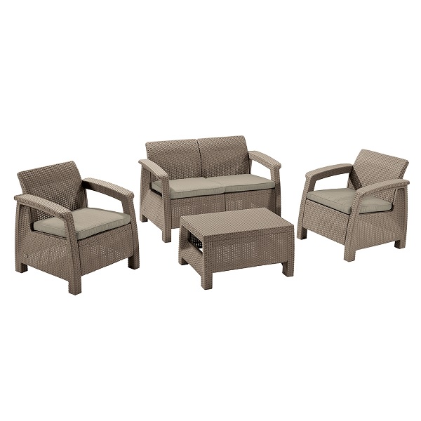 Комплект садовой мебели keter corfu ii set cappuccino. Комплект садовой мебели CORFU SET cappuccino – то, что нужно для отдыха на даче в кругу семьи. Стильный и функциональный. Благодаря компактным размерам его можно разместить на небольшой веранде или лужайке под тентом Green Glade. Садовая мебель изготовлена целиком из прочного полипропилена, поэтому имеют высокую механическую прочность и долговечность. Она не ржавеет, устойчива к повышенным температурам и выгоранию – ее можно оставлять на участке и в дождь, и на ярком солнце. Каждый элемент садовой мебели CORFU SET cappuccino имеет малый вес, поэтому его легко перемещать с места на место, чтобы создать зону отдыха там, где вам хочется сейчас. • Комплектация: двухместный диван, два кресла, столик • Размер дивана (ШхГхВ): 128х70х79 см • Размеры кресел (ШхГхВ): 75х70х79 см • Размер стола (ДхШхВ): 77х57х42 см • Вес нетто: 29,3 кг • Материал: полипропилен имитирующий плетение под ротанг • Цвет: капучино • Размер упаковки: 120х82х62 см • Вес брутто: 37,8 кг • Производитель: Keter • Страна: Израиль
