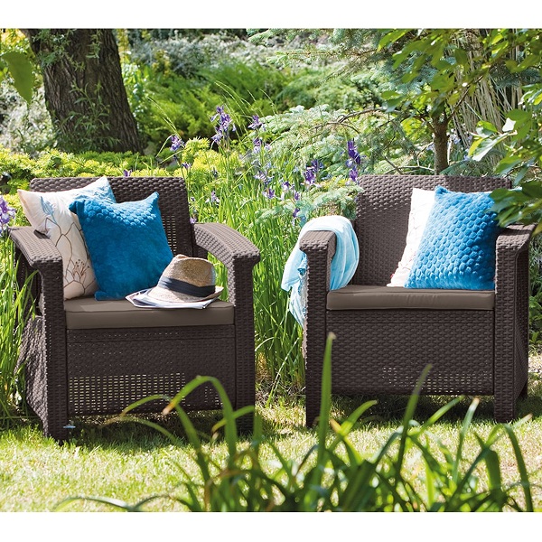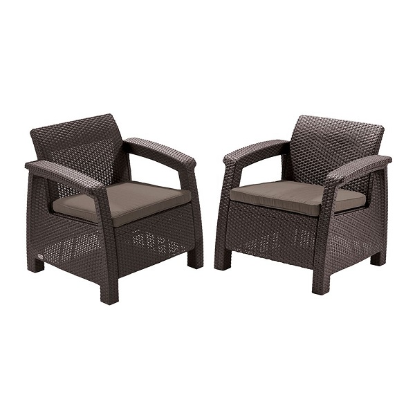 Кресла садовые keter corfu ii duo brown 2 шт. Комплект мебели CORFU DUO brown состоящий из двух удобных садовых кресел - отличное решение, чтобы посидеть вдвоем на открытой веранде или лужайке, а также как дополнение к дивану CORFU LOVE SEAT, если вы ждете в гости друзей. Кресла изготовлены целиком из прочного полипропилена, поэтому имеют высокую механическую прочность и долговечность. Они не ржавеют, устойчивы к повышенным температурам и выгоранию – их можно оставлять на участке и в дождь, и на ярком солнце. Также, комплект мебели CORFU DUO brown имеет малый вес, поэтому его легко перемещать с места на место, чтобы создать зону отдыха там, где вам хочется сейчас. • Размеры кресел (ШхГхВ): 75х70х79 см • Вес нетто: 14,5 кг • Материал: полипропилен имитирующий плетение под ротанг • Цвет: коричневый • Размер упаковки №1: 120х80х35 • Вес брутто: 22 кг • Производитель: Keter • Страна: Израиль