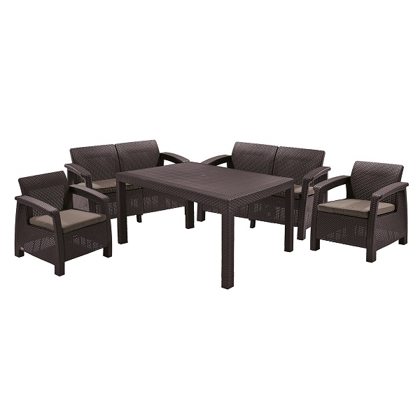 Комплект садовой мебели keter corfu ii fiesta brown. Комплект садовой мебели CORFU FIESTA brown – для большой и дружной компании, ведь он состоит из 2 диванов, 2 кресел и полноценного обеденного стола. Садовая мебель изготовлена целиком из прочного полипропилена, поэтому имеют высокую механическую прочность и долговечность. Она не ржавеет, устойчива к повышенным температурам и выгоранию – ее можно оставлять на участке и в дождь, и на ярком солнце. Каждый элемент садовой мебели CORFU FIESTA brown имеет малый вес, поэтому его легко перемещать с места на место, чтобы создать зону отдыха там, где вам хочется сейчас. • Комплектация: два двухместных дивана, два кресла, стол • Размеры диванов (ШхГхВ): 128х70х79 см • Размеры кресел (ШхГхВ): 75х70х79 см • Размер стола (ДхШхВ): 160,5х94,5х74,5 см • Вес нетто: 55 кг • Материал: полипропилен имитирующий плетение под ротанг • Цвет: капучино • Количество коробок: 3 штуки • Размеры: 1 - 120х80х42 см; 2 - 160,5х94,5х10 см; 3 - 120х80х42 см • Вес брутто: 66 кг • Производитель: Keter • Страна: Израиль