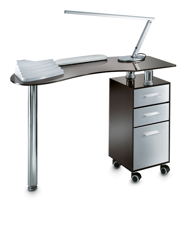 Стол маникюрный 186 l. Маникюрный стол с одной тумбой, столешница и тумба из стекла. Тумба маникюрного стола оснащена тремя выдвижными ящиками из металла и колесами для удобства перемещения. В комплекте: лампа, валик маникюрный, подставка под лаки. Цвет стекла: - Fumè. Вес: 54 кг; Объем: 0,34 м³; Количество мест: 3. Размер (ДхШхВ): 110x55x77 см Стоимость модели, представленной на фото, может отличаться от цены, указанной на сайте. Артикул: 186 L Бренд: Artecno