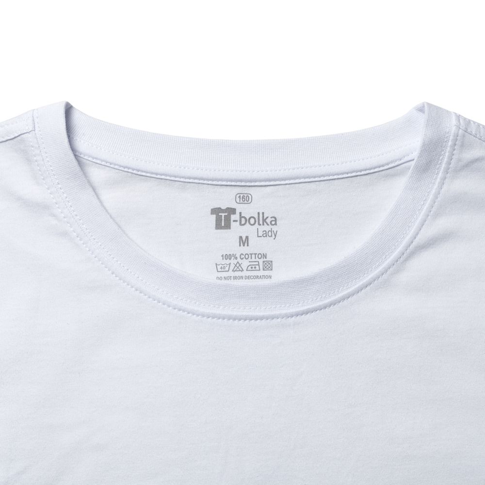 Футболка женская t-bolka lady, белая. Размеры S–XL Материал хлопок 100%, плотность 160 г/м?; джерси Вес (1 шт.) 200 г Транспортная упаковка 47,0x30,0x32,0 см Вес 15,00 кг Объем упаковки 0,045 м? Количество в упаковке 100 шт. Виды нанесения B-Шелкография (5 цветов) B-Шелкография DTG1-Полноцвет по белому текстилю DTG2-Полноцвет по цветному текстилю E-Цифровой трансфер F1-Флекс (1 цвет) F2-Флекс (1 цвет) IS1-Шеврон с припариванием IS2-Шеврон с пришиванием I-Вышивка Кроеная женская футболка с круглым воротом-резинкой (рибана 1x1 с лайкрой). Высокое качество материалов: полотно джерси (кулирная гладь), прошедшее предварительную термоусадку; нить 30/1; особо гладкая гребенная пряжа. Активное крашение полотна. Двойная прострочка плечевых швов. Футболки представлены в двух версиях. Версия 1 — с печатным ярлыком, в версии 2 размер указан на вшивном ярлыке в горловине, а информация по уходу - на бирке в боковом или плечевом шве. Футболки версии 2 (без печатного лейбла) выделены добавлением v2 к обозначению размера.