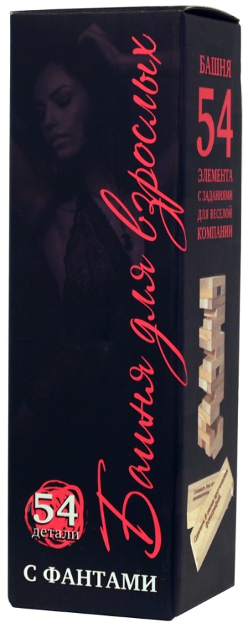 Что в коробке 54 бруска Правила игры Ищете хороший для своей любимой, лучшего друга, начальника с работы или для себя родимого? А ведь у нас уже все готово – купить настольную игру Башня с заданиями для взрослых. Вы спросите – кого можно удивить деревянными кубиками в 2017 году, когда развивается виртуальная реальность, а количество ядер в компьютере перевалило за 8? Можете быть уверены – уже после 1-2 партий в эту удивительную «настолку» вы получите такую массу эмоций, что никакая Dota или Counter-Strike не смогли за все время своего существования. Башня отлично подходит для людей, которые любят собираться компаниям и развлекаться, но не хотят «грузить» себя излишними трудностями. Здесь все становится понятно с первого раза – строим башню вместе и надеемся, что один «горе-рабочий» (главное – не вы сами) сломает конструкцию. Рекомендуем, кстати, поработать над собственными нервами мелкой моторикой и ловкостью рук – здесь именно от них зависит все полностью. Хотя, если знаете как – подружитесь с удачей, ведь иногда она может сыграть вам на руку. Просто, но азарт - бесконечный Для игры подойдет любая ровная поверхность, стол, тумба, пол Вначале вместе выстраиваете башню – по 3 бруска в одном ряду, причем каждый следующий повернут на 90 градусов. Теперь наступает черед самой игры – в свой ход участник вытаскивает один из нижних блоков и ставит в верхний ряд. Причем дотрагиваться до соседних нельзя, начинать новый ряд, не закончив нынешний нельзя, пропускать ход нельзя. А вот и главная изюминка подоспела На некоторых брусках имеются надписи с простенькими, но уж очень веселыми заданиями для участников, например: Сфотографироваться в стиле Ню Познакомиться с соседкой На ощупь определить предмет – нужно будет использовать «пятую точку»