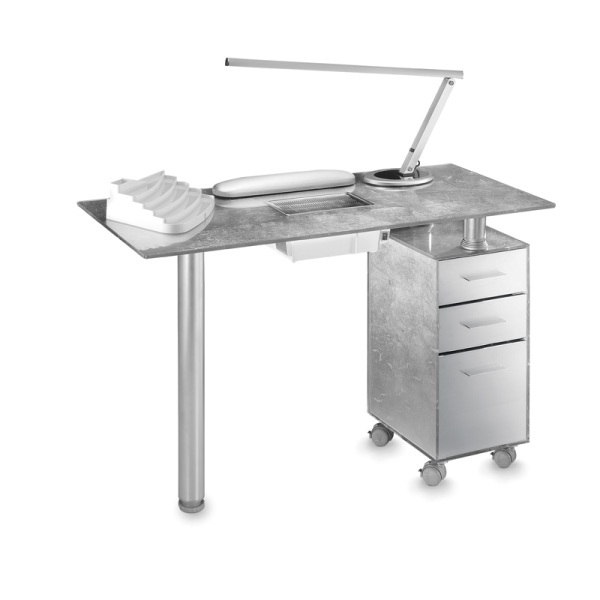 Стол маникюрный 192 lx. Маникюрный стол с одной тумбой, столешница и тумба из стекла. Тумба маникюрного стола оснащена тремя выдвижными ящиками из металла и колесами со стопорами для удобства перемещения. В комплекте: лампа, валик маникюрный, подставка под лаки, вытяжка AR5 Superturbo 60W. Цвет стекла: - Silver leaf. Вес: 56 кг; Объем: 0,35 м³; Количество мест: 3. Размер (ДхШхВ): 115x50x76 см Стоимость модели, представленной на фото, может отличаться от цены, указанной на сайте. Артикул: 192 LX Бренд: Artecno
