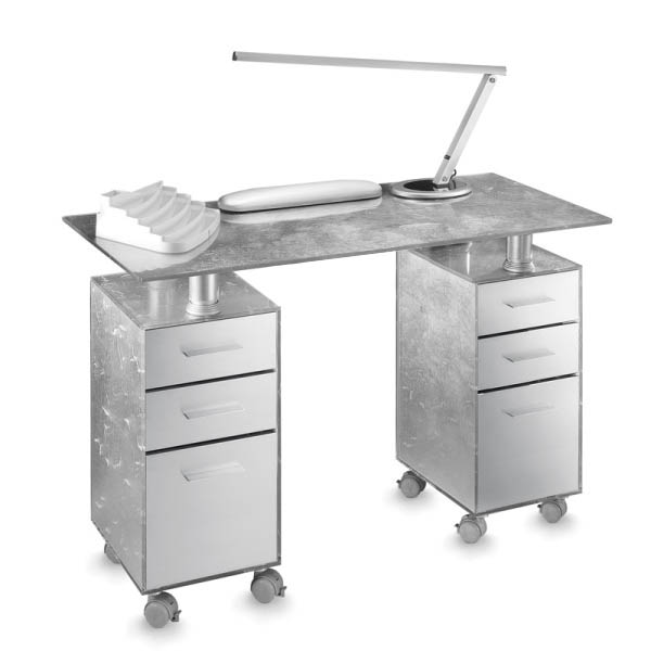 Стол маникюрный 193 l. Маникюрный стол с двумя тумбами, столешница из стекла, тумбы из стекла, каждая с тремя выдвижными ящиками из металла, на колесах. В комплекте: лампа, подушка маникюрная, подставка под лаки. Цвет стекла: - Silver leaf. Вес: 86 кг; Объем: 0,51 м³; Количество мест: 4. Размер (ДхШхВ): 115x50x76 см Стоимость модели, представленной на фото, может отличаться от цены, указанной на сайте. Артикул: 193 L Бренд: Artecno