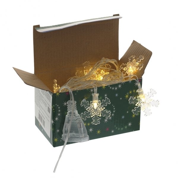 Электрогирлянда комнатная Снежинка, L4,8 м, 20 LED ламп изготовленных в виде снежинки, свет теплый белый, 2W, 220V, расстояние между лампами 18 см, 1 режим свечения, шнур прозрачный 1 м, коннектор, адаптер. Степень влагозащиты: IP20, подходит для использования только в помещении.