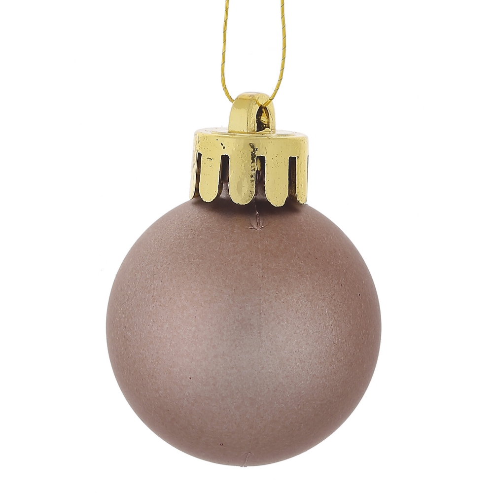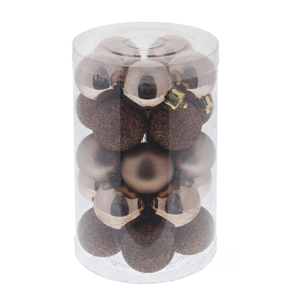 Набор из 25шт, украшение новогоднее шар шоколадное удовольствие, d3 см, l8 w8 h13 см. Материал: Полимерные материалы Набор из 25-ти елочных шаров, диаметром 3 см, выполнен в единой цветовой гамме. В составе набора - пластиковые шары разной фактуры - глянцевые, матовые и с глиттером. Прекрасно смотрятся в убранстве новогодней ели. Поставляются в прозрачной пластиковой упаковке. Вес, кг: 0. 059