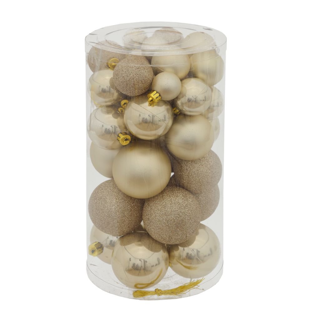 Набор из 40шт украшение новогоднее шар, d3/4/5/6 см, l14 w14 h26 см. Материал: Полимерные материалы Набор из сорока елочных шаров, диаметром 6/5/4/3 см, выполнен в единой цветовой гамме. В составе набора - пластиковые шары разной фактуры - глянцевые, матовые, с глиттером. Прекрасно смотрятся в убранстве новогодней ели. Поставляются в прозрачной пластиковой упаковке. Вес, кг: 0. 223