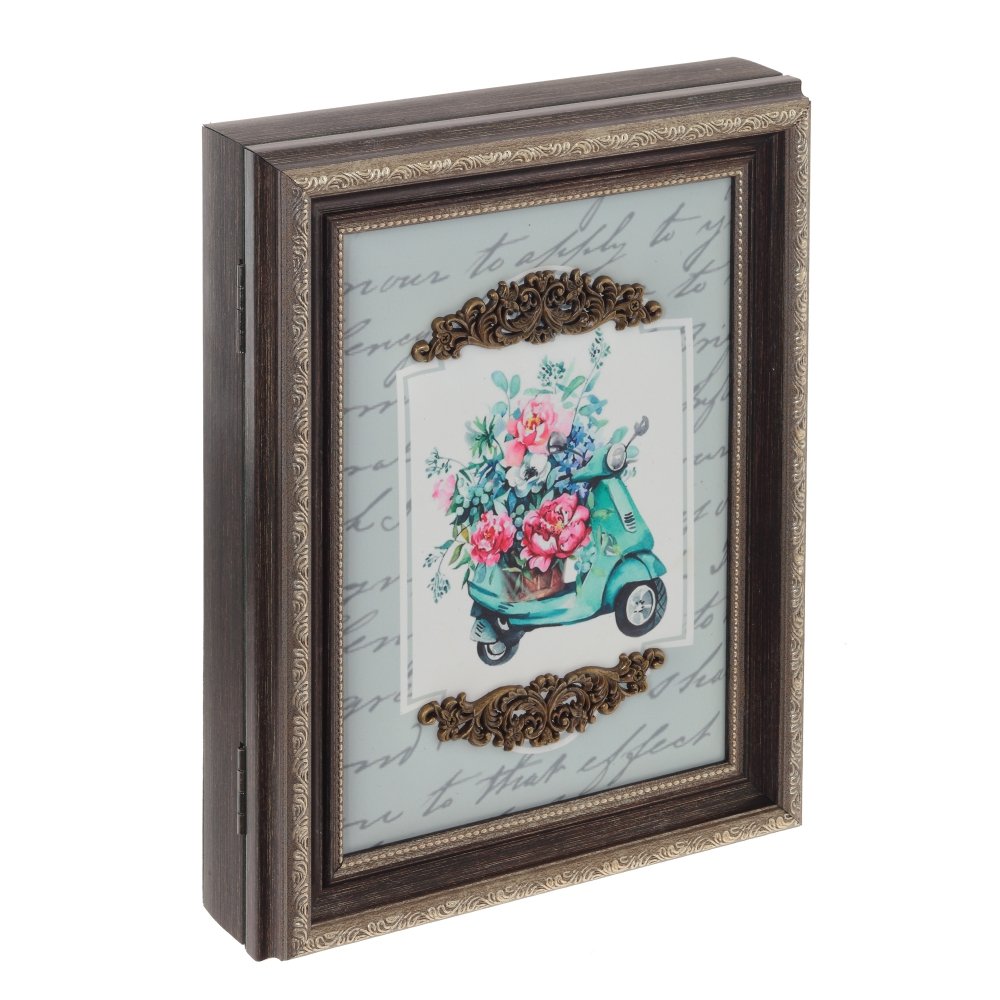 Ключница, l22 w5 h28 см. Материал: МДФ/Полимерные материалы/Металл Стильная ключница для современного интерьера. Ключница закрытого типа с пятью крючками. Дверца с изображением яркого мотоцикла с цветами и ажурным металлическим декором. Закрывается сбоку на магнит. Ключница – предмет не только красивый, но и функциональный, поэтому ей найдется место и в офисе, и в квартире, и в загородном доме. Вес, кг: 0. 899