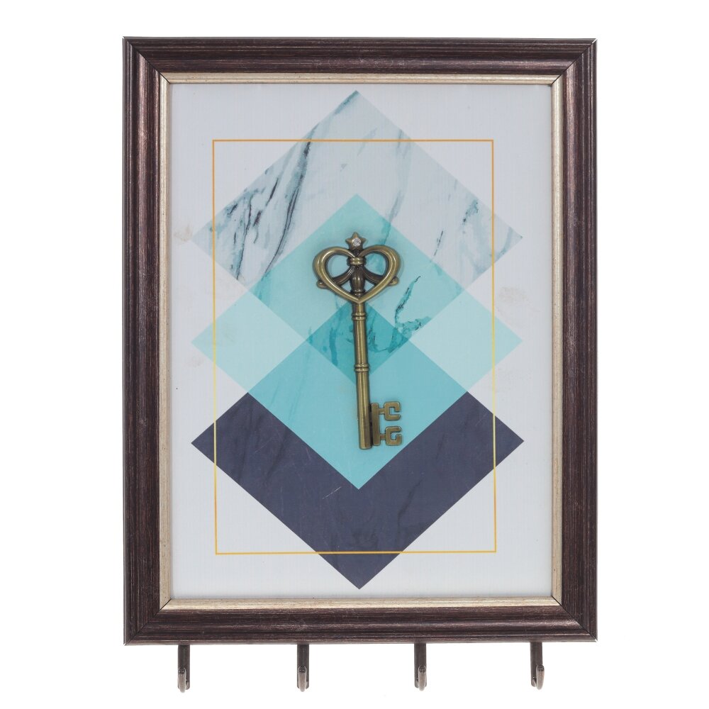 Ключница открытого типа с четырьмя крючками. Украшена геометрическим рисунком и декоративным металлическим элементом в виде ключа. Ключница – предмет не только красивый, но и функциональный, поэтому ей найдется место и в квартире, и в загородном доме.
