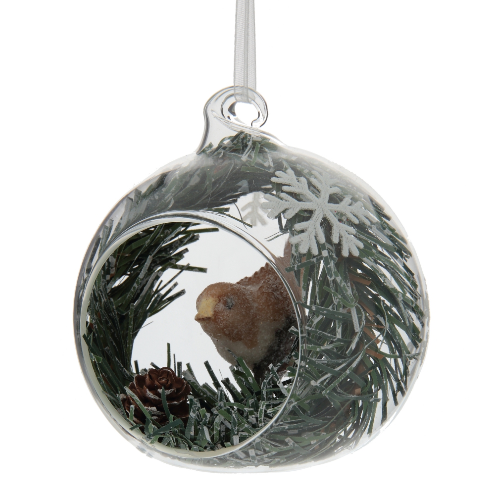 Украшение новогоднее шар, l8 w7 h8 см. Материал: Стекло Стеклянная прозрачная елочная игрушка будет чудесно смотреться на елочке, а хвойные веточки и фигурка внутри украшения добавят убранству атмосферу зимнего леса. Вес, кг: 0. 068