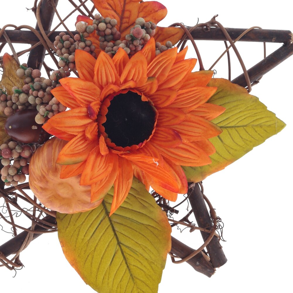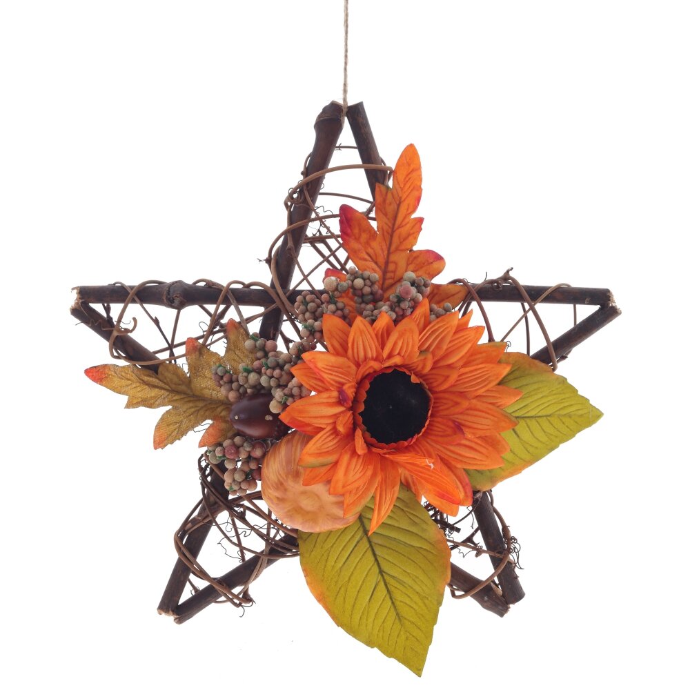 Изделие декоративное, l30 w8 h31 см. Материал: Полимерные материалы/Текстиль/Дерево Колоритное, теплое, уютное настенное украшение в форме звезды. Подарит массу приятных эмоций, придаст вашему интерьеру индивидуальность, станет отличным подарком друзьям и близким. В основе веточки, декорировано искусственными листьями, цветами и ягодами ярких осенних цветов. Вес, кг: 0. 148