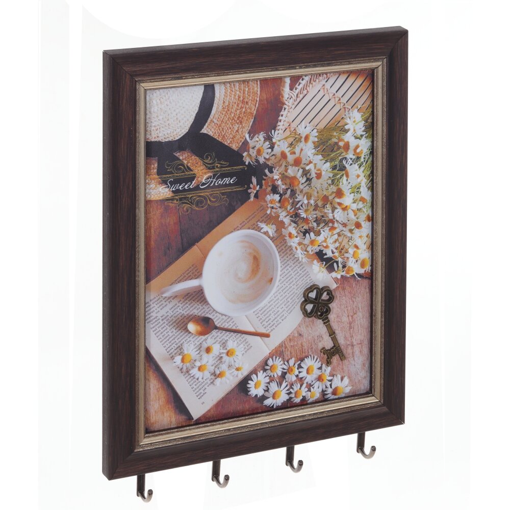 Ключница, l22 w2,5 h30 см. Материал: Дерево/Полимерные материалы/Металл Ключница настенная открытого типа в багетной раме с четырьмя металлическими крючками, декорированная ярким изображением и декоративным металлическим элементом в виде ключа. Ключница – предмет не только красивый, но и функциональный, поэтому ей найдется место и в офисе, и в квартире, и в загородном доме. На задней стенке ключницы есть крепления для подвешивания на вертикальную поверхность. Вес, кг: 0. 385
