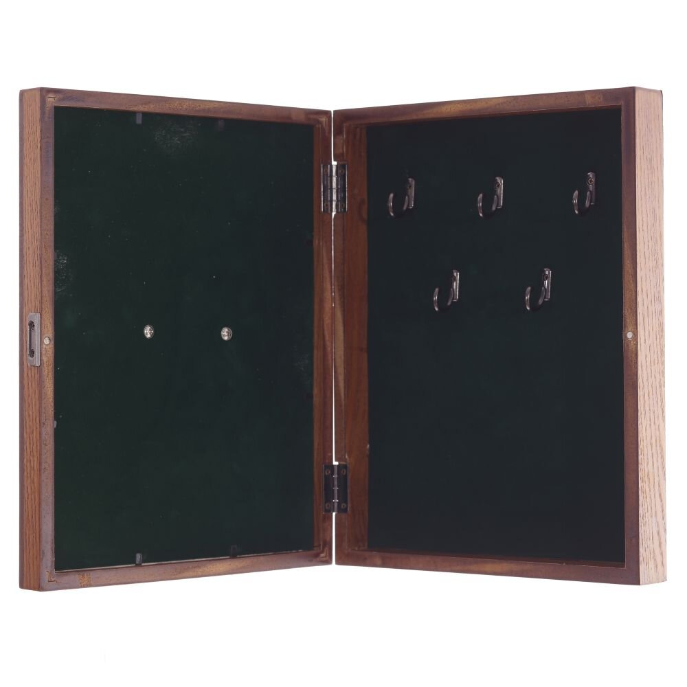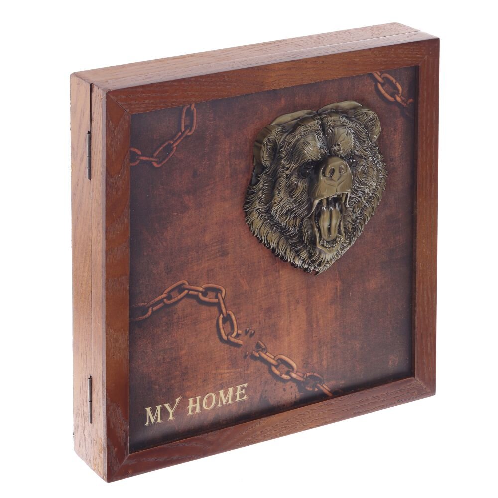 Ключница, l26 w5 h26 см. Материал: МДФ с натуральным шпоном/Металл Ключница закрытого типа с пятью крючками. Цвет коричневый с декором в виде головы медведя. Внутри отделана тканью под бархат. Закрывается на магнитную защелку. Крепится на стену с помощью двух металлических петелек. Вес, кг: 1. 083