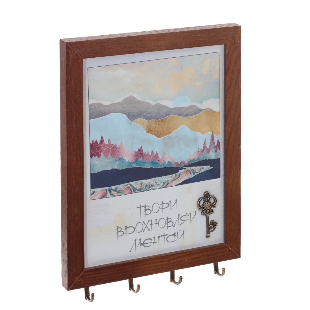 Ключница, l22 w2,5 h30 см. Материал: МДФ/Металл Ключница открытого типа с четырьмя крючками. Цвет рамки - коричневый. Центральная часть с изображением горного пейзажа, декором в виде ключа и надписью Твори, вдохновляй, мечтай. Изделие выглядит современно и стильно. Не отказывайте себе в удовольствии созерцать это произведение каждый день. Вес, кг: 0. 49