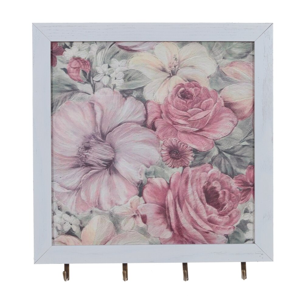 Ключница, l27 w2,5 h29 см. Материал: МДФ/Металл Ключница открытого типа с четырьмя крючками. Цвет рамки - белый. Центральная часть с изображением розовых и белых цветов. Изделие выглядит современно и стильно, не отказывайте себе в удовольствии созерцать его каждый день. Вес, кг: 0. 541