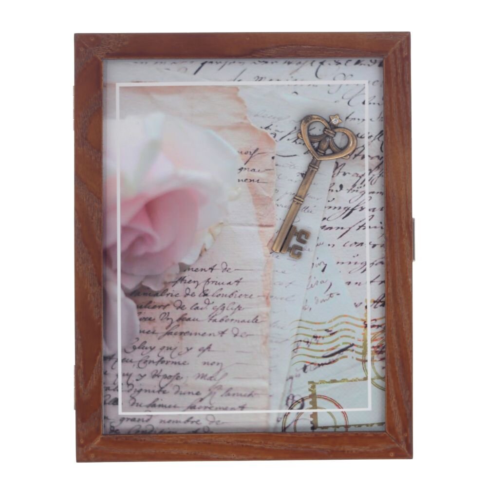 Ключница закрытого типа с пятью крючками. Цвет коричневый с нежным декором. Внутри отделана тканью под бархат. Закрывается на магнитную защелку. Крепится на стену с помощью двух металлических петелек.