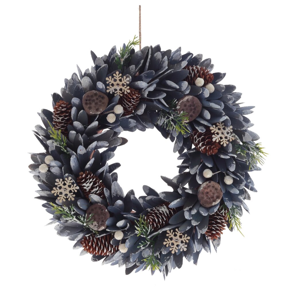 Изделие декоративное венок, l34 w8 h34 см.   Материал: Натуральные материалы/Полимерные материалы Новогодний декоративный венок с декором из натуральных шишек, искусственных ягод, листьев и хвойных веточек будет уместен в любом интерьере, создавая уют и праздничное настроение.  Вес, кг: 0. 437