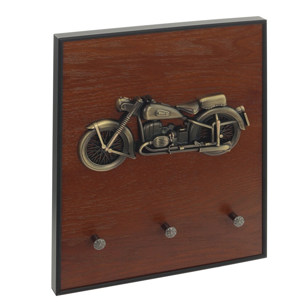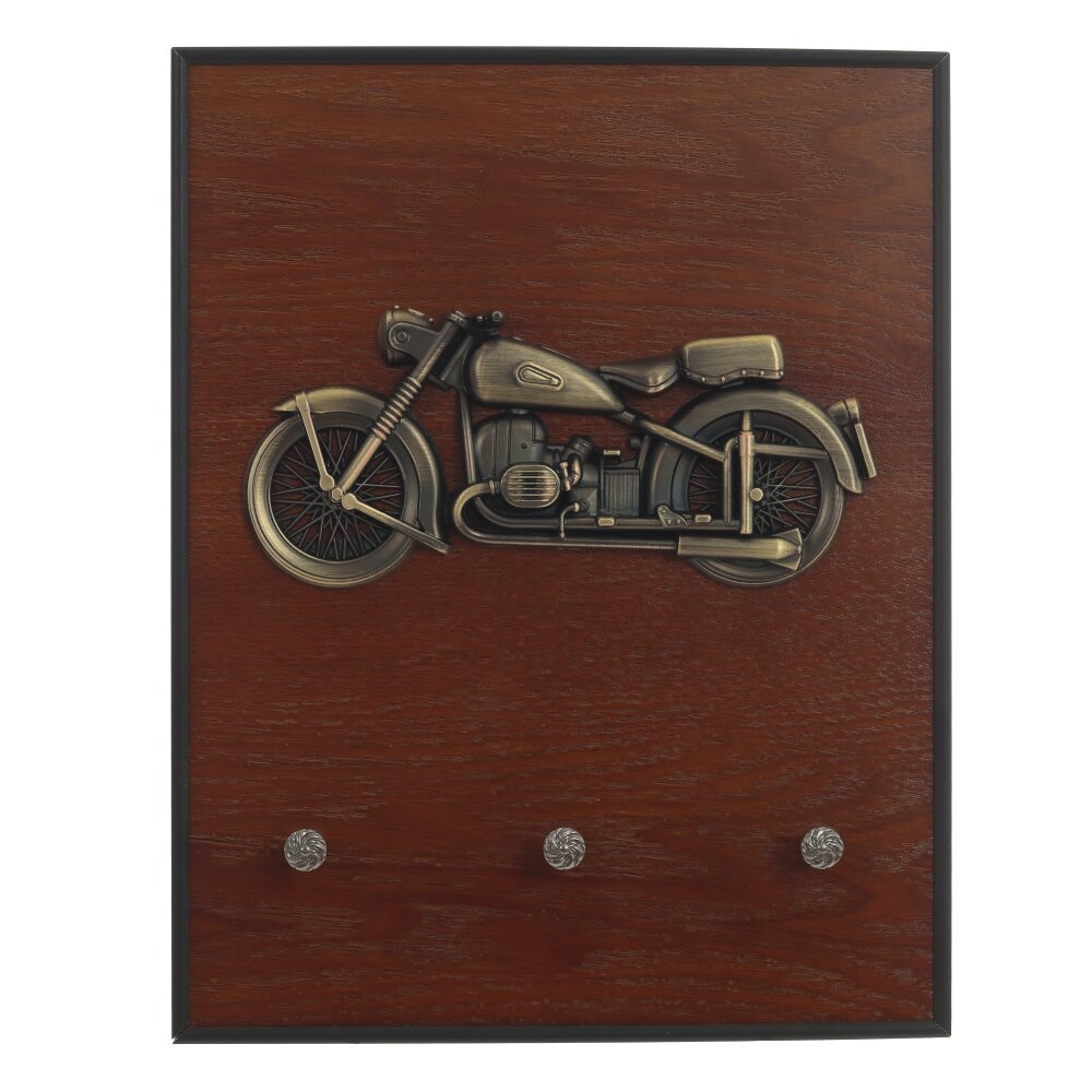 Ключница, l22 w3 h28 см. Материал: Дерево/Металл Ключница настенная с тремя крючками. Имеет в центре декор в виде мотоцикла. Простой и в то же время оригинальный внешний вид ключницы легко впишется в интерьер любых помещений. Вес, кг: 0. 961