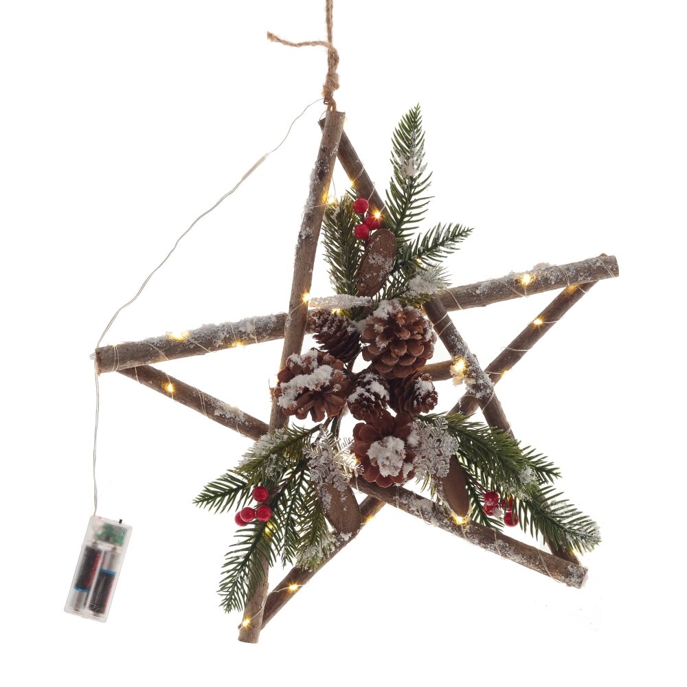 Красивая подвесная звезда из дерева, украшенная шишками, хвойными ветками, ягодами - роскошное новогоднее украшение. Преобразит любое помещение и наполнит его духом приближающегося Нового года и Рождества! Изделие с подсветкой, работает от двух батареек АА (не прилагаются).