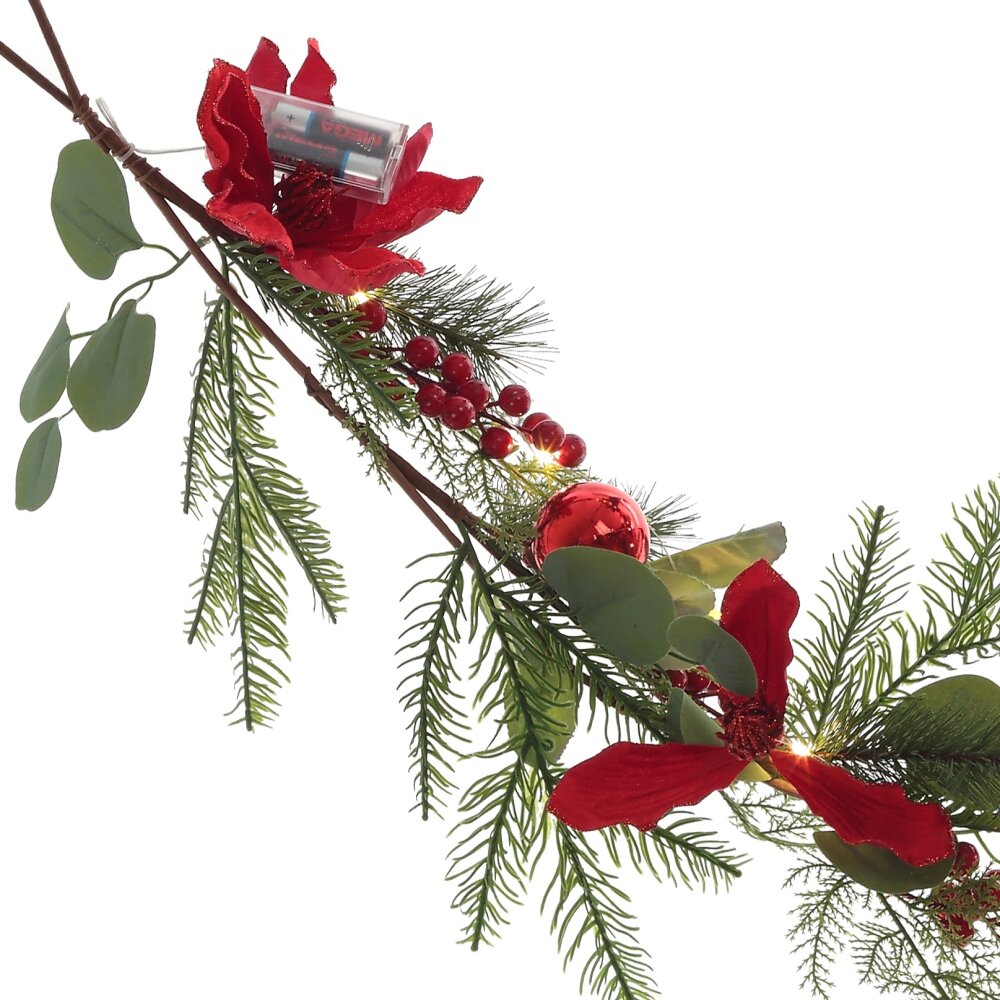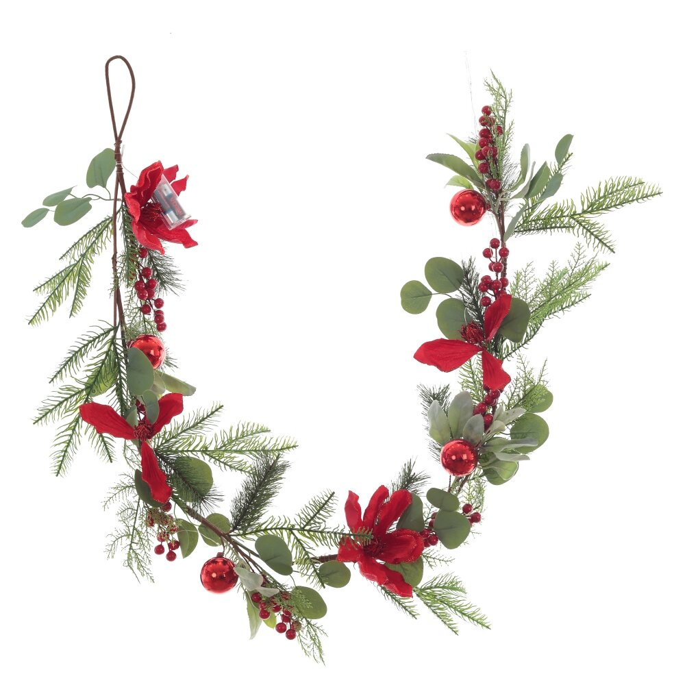 Изделие декоративное гирлянда (подсвет, 2хаа, н/п), l157 w7 h23 см. Материал: Полимерные материалы/Натуральные материалы/Металл Новогодняя гирлянда - это особенно уютное украшение, которым можно украсить свой дом, подарив его обитателям настроение праздника! Сплетена из искусственных хвойных веток и украшена листьями, цветами, шарами и ягодами. Изделие с подсветкой, работает от двух батареек АА (не прилагаются). Вес, кг: 0. 393