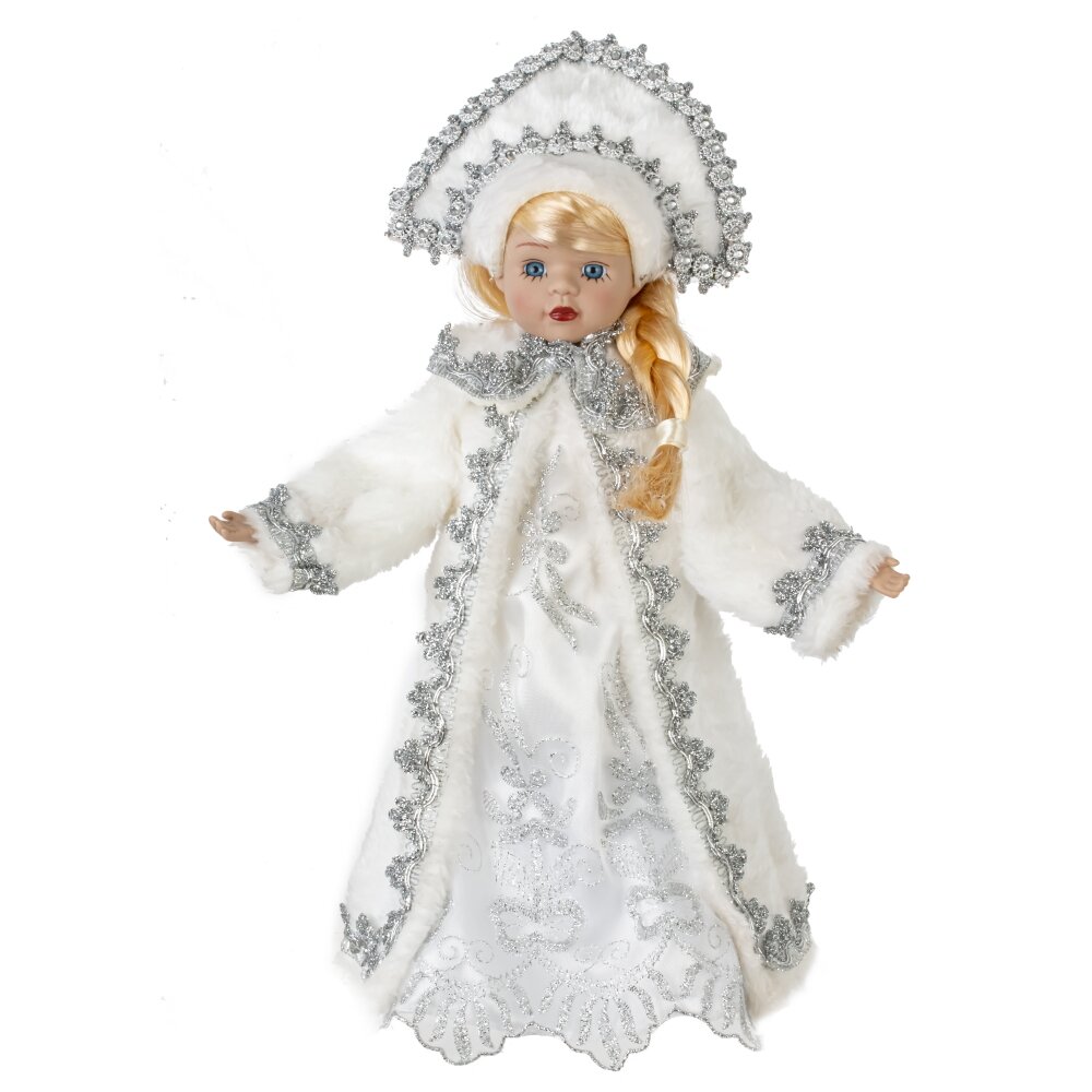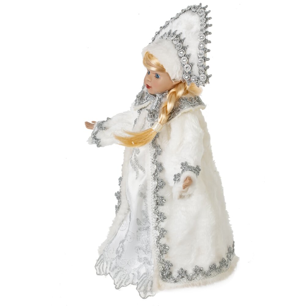 Снегурочка в белом наряде и кокошнике будет прекрасным подарком к Новому году. Ее можно поставить под елку, а так же использовать как милый подарок.