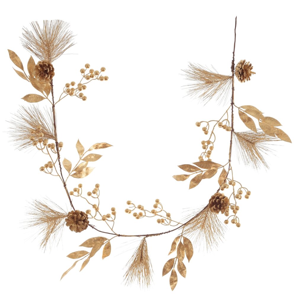 Дивная золотая гирлянда, с украшениями из листьев, ягод и шишок, станет прекрасным элементом новогодней композиции, придавая ей очарование праздника.
