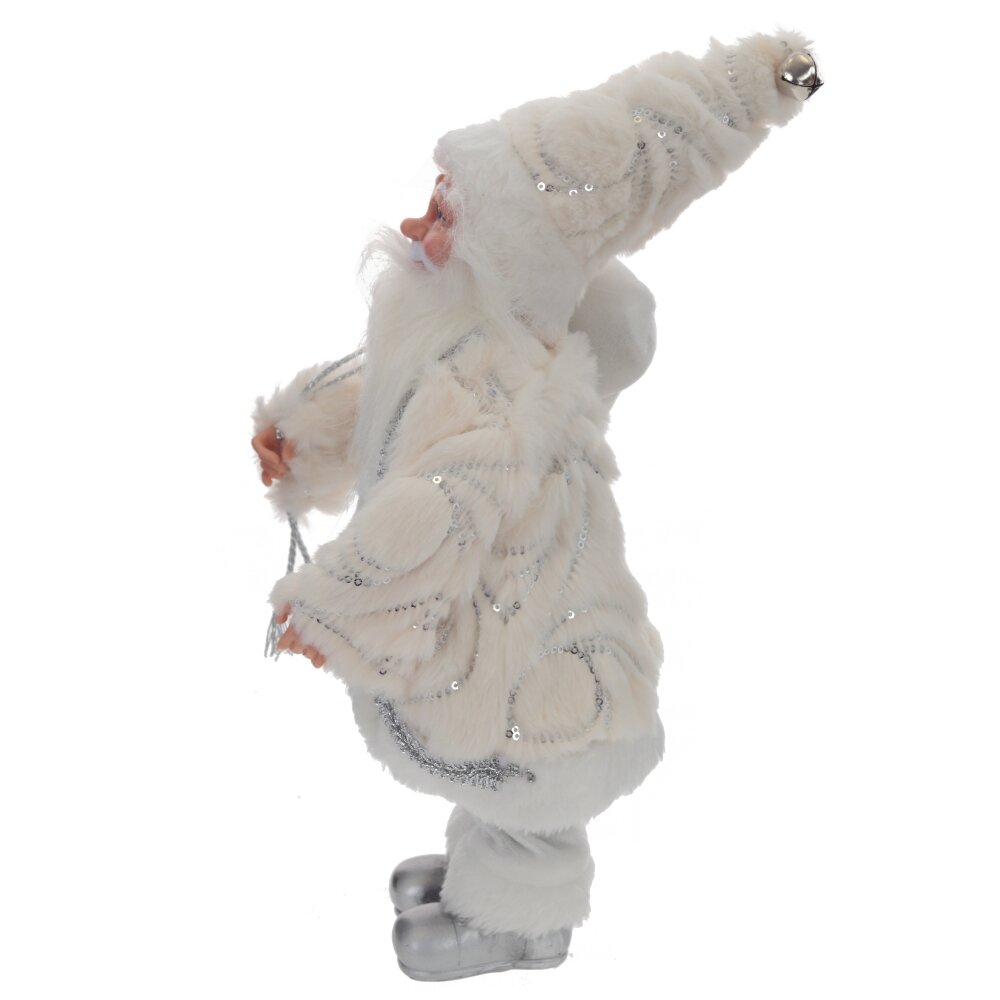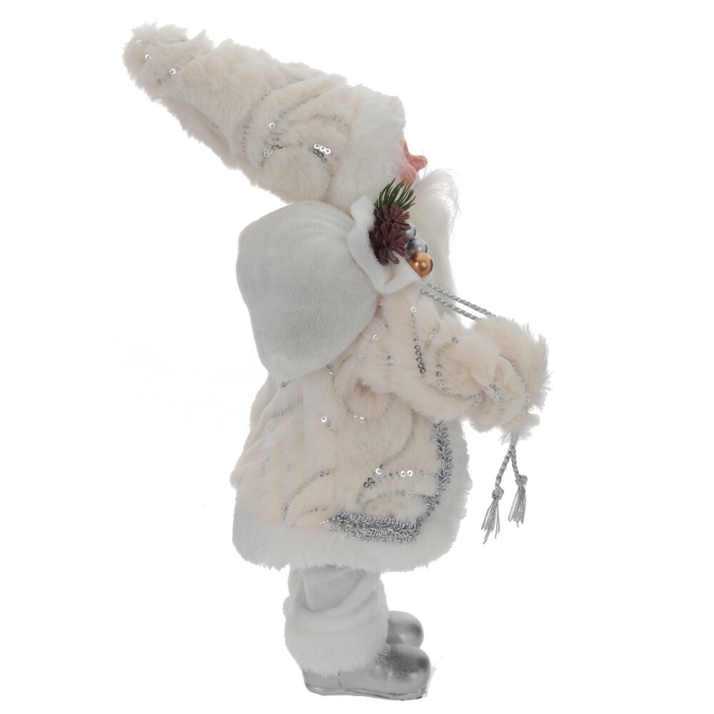 Дед мороз, l15 w15 h31 см. Материал: Очаровательный Дед Мороз станет стильным украшением вашего праздничного интерьера! Этот Дедушка Мороз выполнен в виде куклы. Его лицо и руки выполнены из полимерных материалов, что придает реалистичности и выразительности образу. А красивые глаза, улыбка и пушистая борода из искусственного меха делают дедушку особенно добродушным . Одет Дед Мороз в роскошную белую шубу и колпак, декорированные серебряными пайетками. На плече у Дедушки мешок с подарками, декорированный искусственными шишками, еловой веточкой и бусинами, что делает его еще более праздничным. Дед Мороз станет отличным украшением для новогоднего декора и подарит вам незабываемые впечатления от праздника! Вес, кг: 0. 203