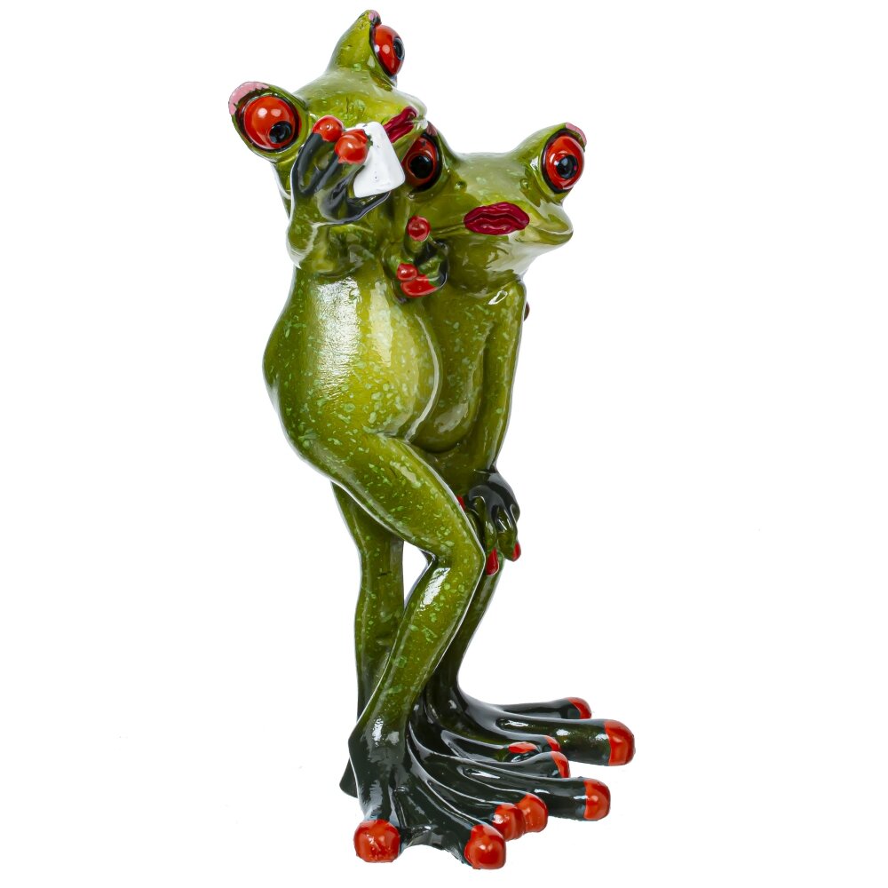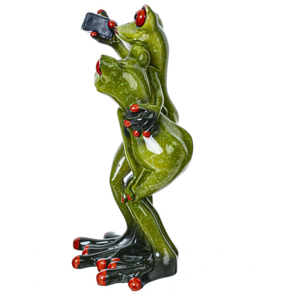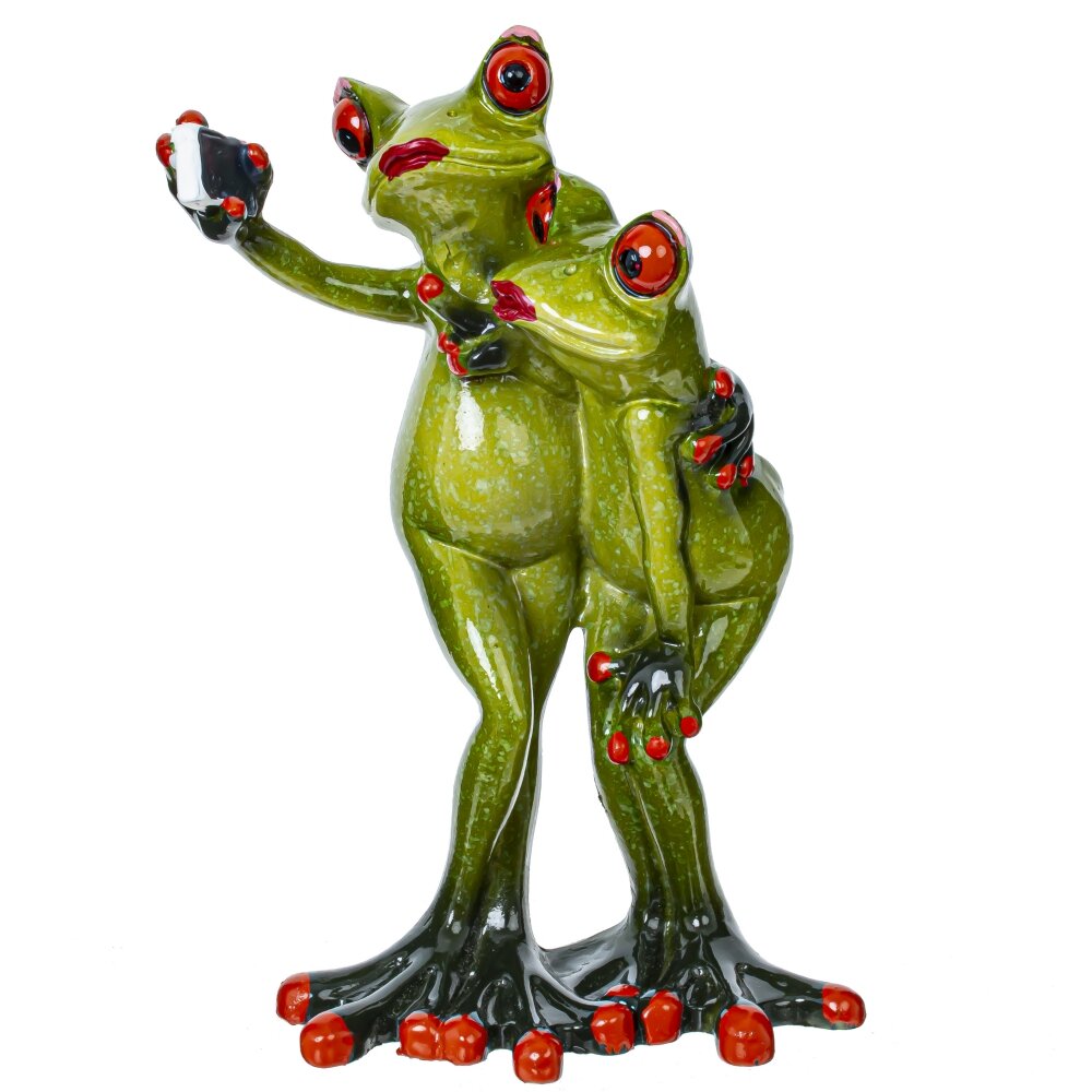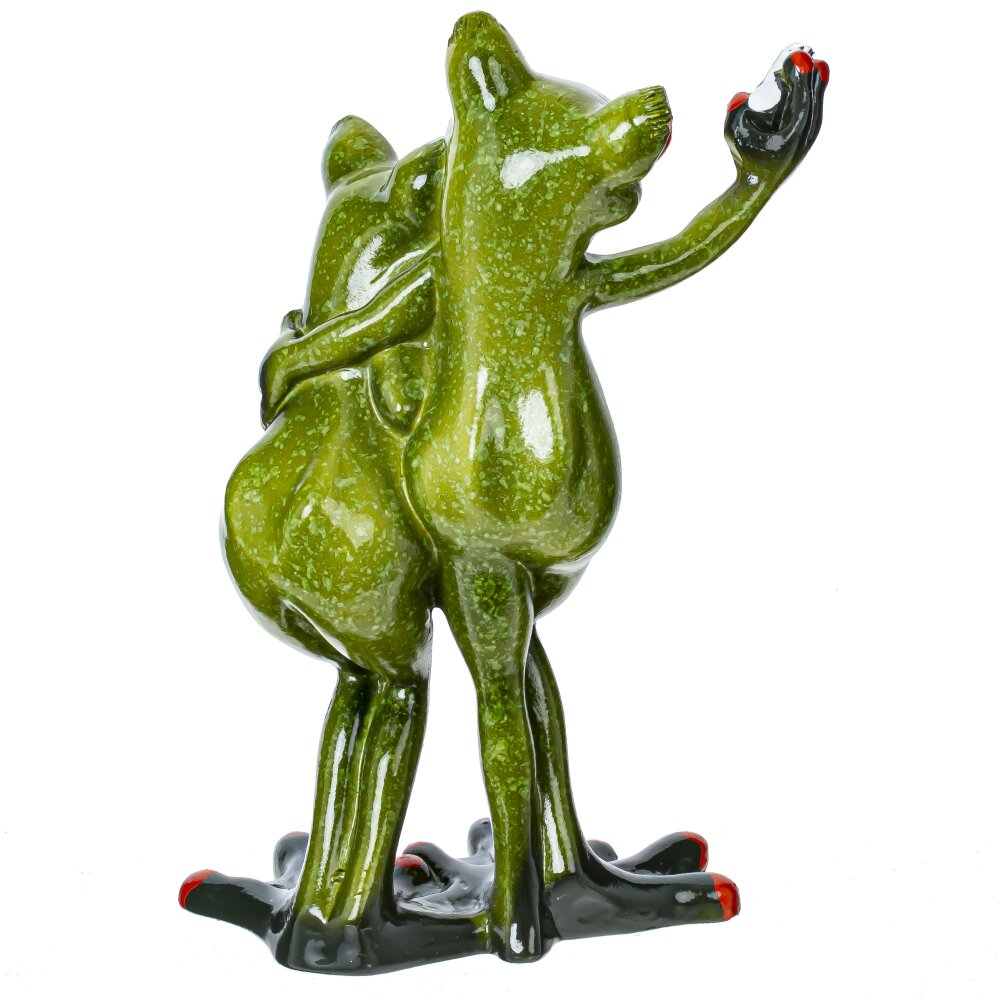 Фигурка декоративная лягушки, l10 w6 h16 см. Материал: Полимерные материалы Перед вами интересная декоративная фигурка, выполненная из полимерных материалов. Она изображает двух веселых лягушек, которые делают совместное селфи. Лягушки обнялись, одна из них держит в руке смартфон, а другая кокетливо прижалась к партнеру. Фигурка покрыта глянцевой эмалью, придающей поверхности блеск и насыщенность цвета. Лягушки выполнены в ярко-зеленых тонах, с характерными красными глазами и пальцами, что добавляет акцент и подчеркивает юмористичность образа. Такая статуэтка станет замечательным украшением интерьера, привнесет в дом элемент игривости и современности, а также создаст радостное настроение у каждого, кто на нее взглянет. Прекрасно подойдет для подарка друзьям или близким, ценящим оригинальные декоративные элементы и позитивные детали в оформлении пространства. Вес, кг: 0. 344