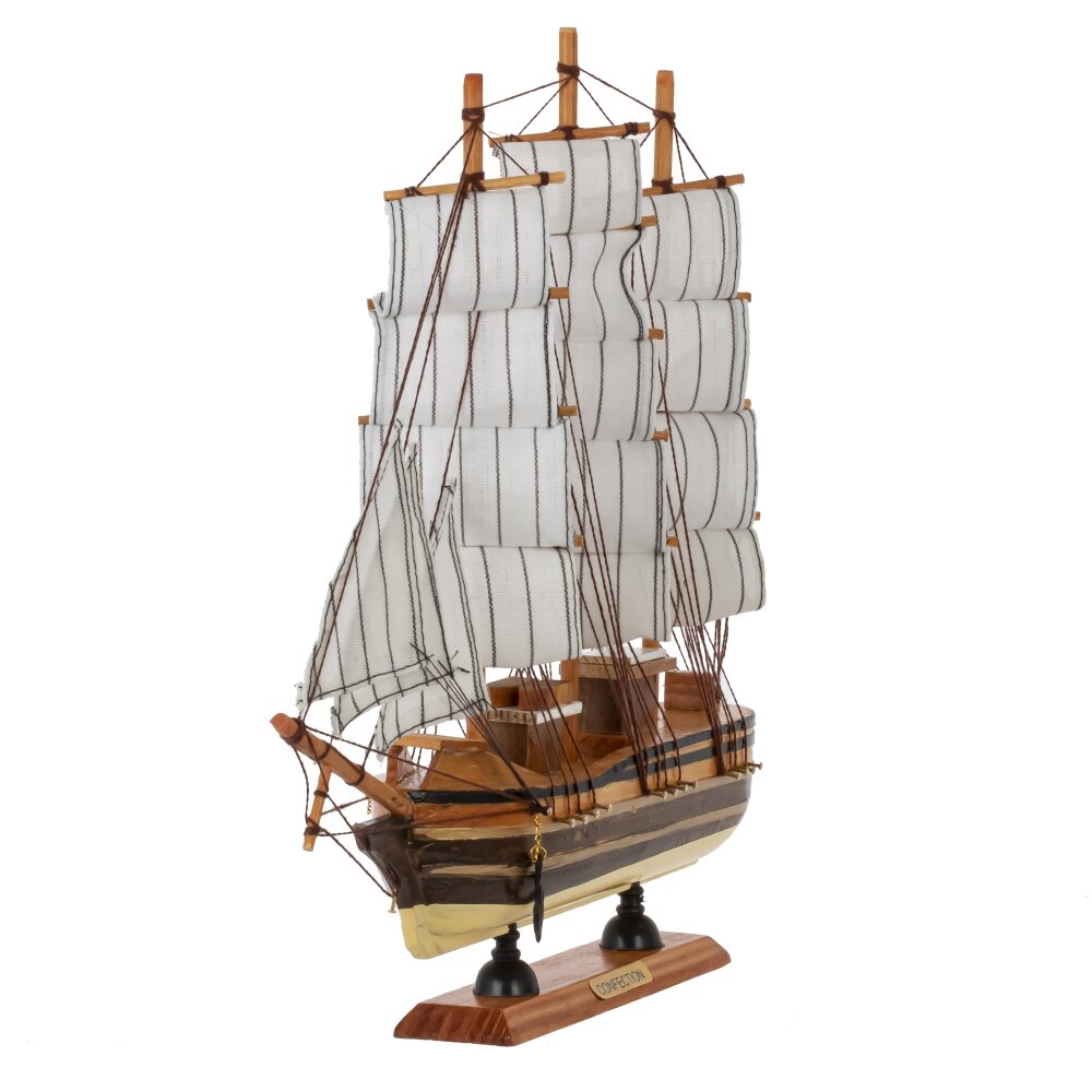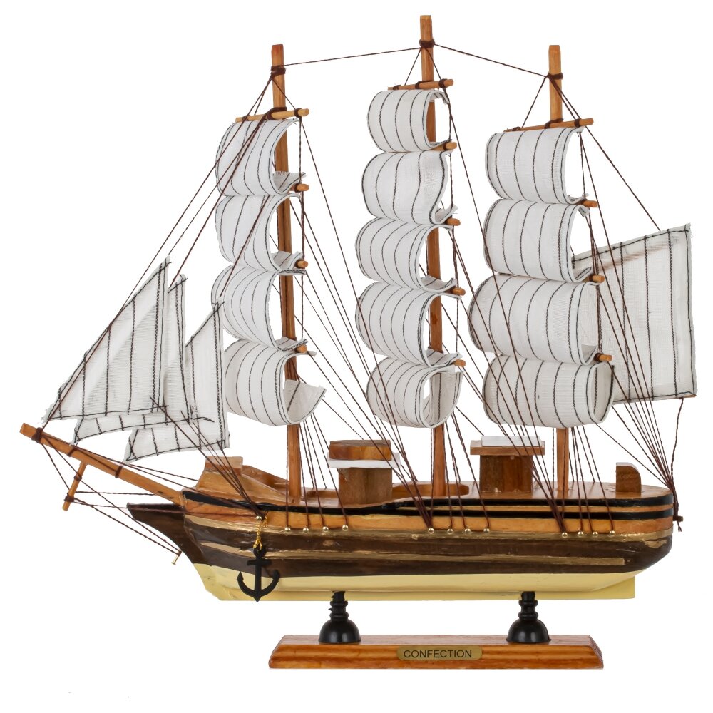 Изделие декоративное корабль, l32 w5,5 h31 см. Материал: Дерево/Текстиль/Полимерные материалы/Металл Модель деревянного парусника состоит из множества мелких подробных деталей. Корабль устойчиво стоит на горизонтальной поверхности благодаря широкой деревянной подставке. Это изделие прекрасно дополнит любое помещение - будь то гостиная, кабинет или детская комната. Он станет не только ярким акцентом в интерьере, но и символом приключений, свободы и морских путешествий. Вес, кг: 0. 442