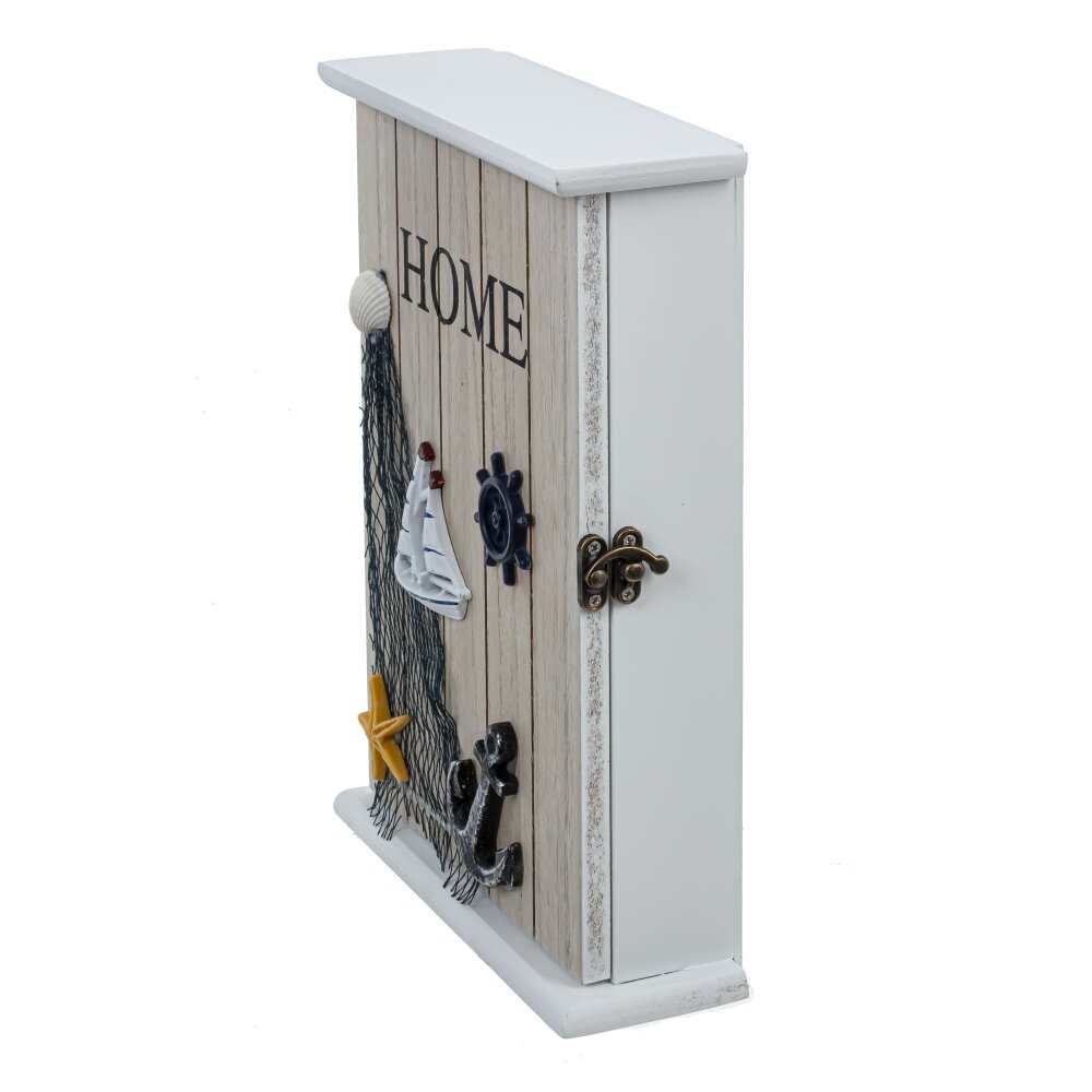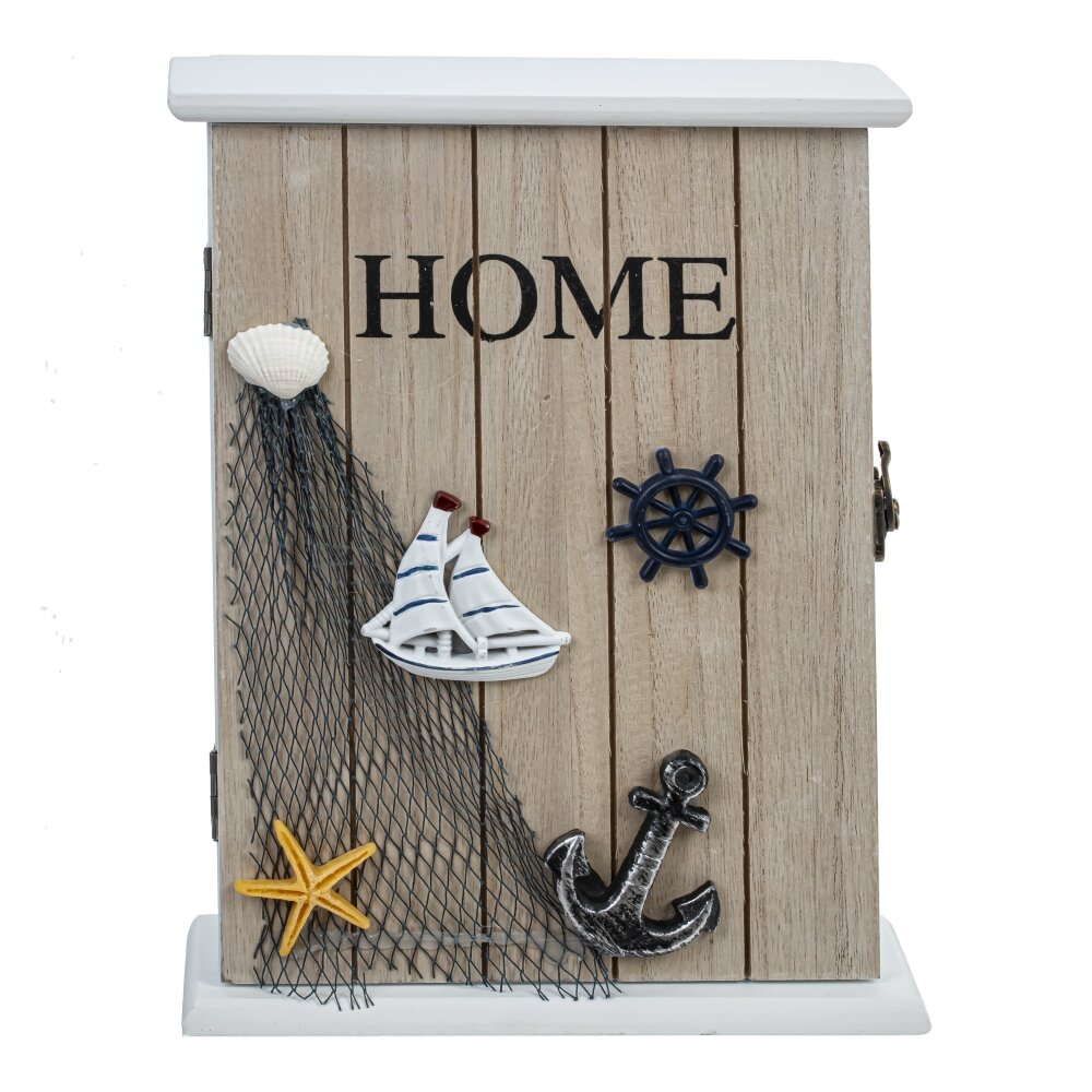 Ключница, l19 w6 h26 см. Материал: Дерево/Полимерные материалы/Металл/Стекло Ключница настенная в морском стиле. Изготовленная из дерева, она придает ощущение природной теплоты и уюта. Объемный декор в виде ракушек, кораблика, якоря и рыболовной сети создает атмосферу моря и путешествий, добавляя особый шарм и легкость. Эта ключница станет отличным украшением для любого помещения и неповторимым акцентом в вашем интерьере. Ее теплый и уютный дизайн привнесет в ваш дом нотку морского бриза и радости от отдыха у моря, напоминая о ярких моментах жизни и путешествиях. Ключница закрытого типа, с шестью крючками. Вес, кг: 0. 728