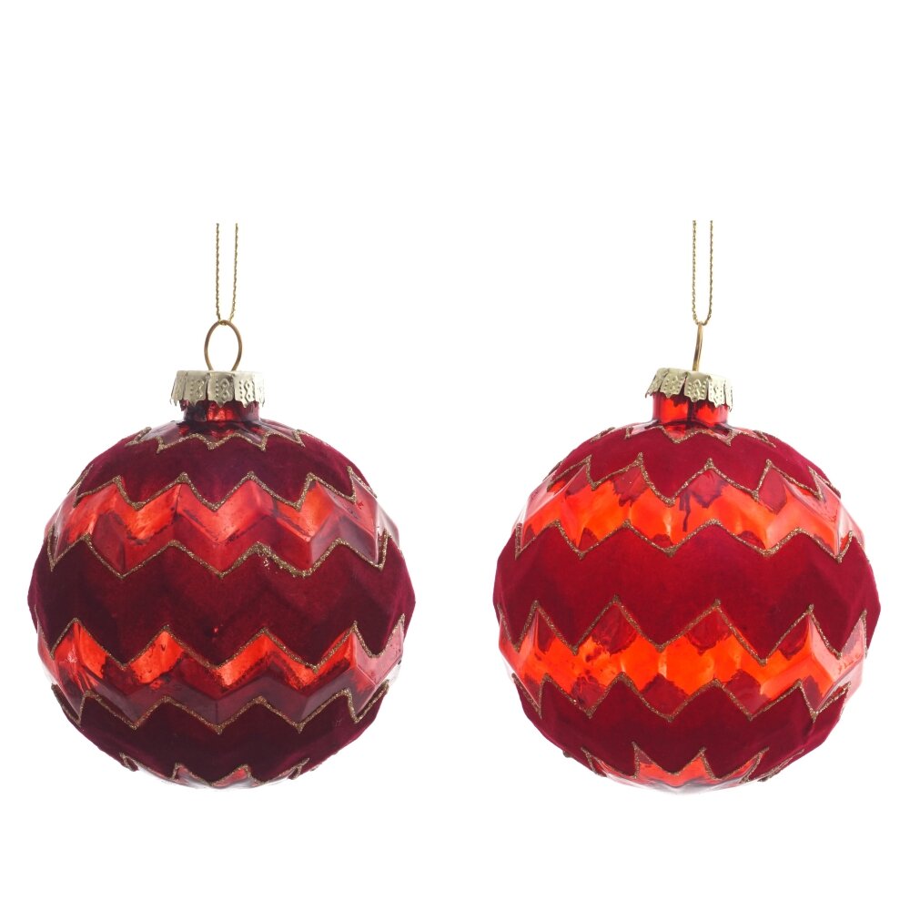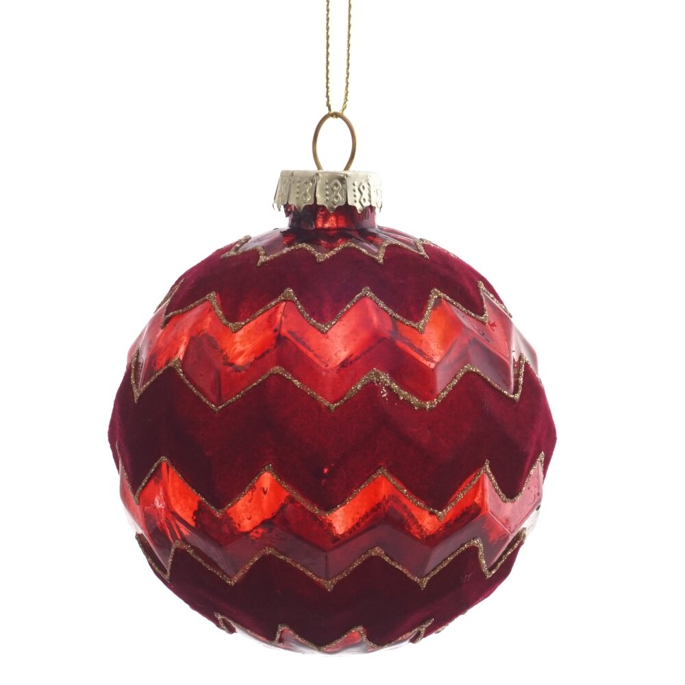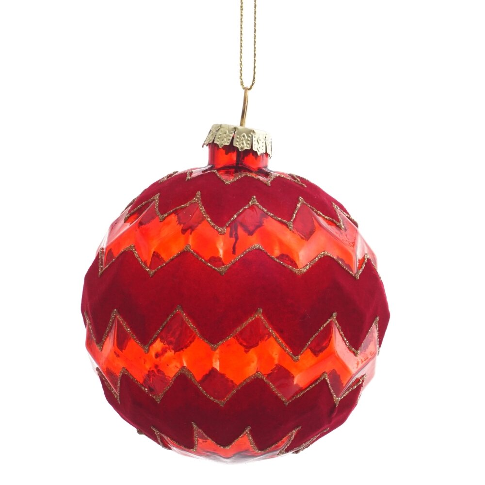 Елочное украшение Шар выполнено из нежного стекла, придающего ему легкость и изящество. Зигзагообразные полоски, сочетающие прозрачные и бархатные текстуры, создают эффект глубины и игры света, добавляя яркости и теплоты в атмосферу праздника. Этот шар станет идеальным дополнением к любой елке, подчеркивая её стиль и создавая настроение волшебства и радости.
