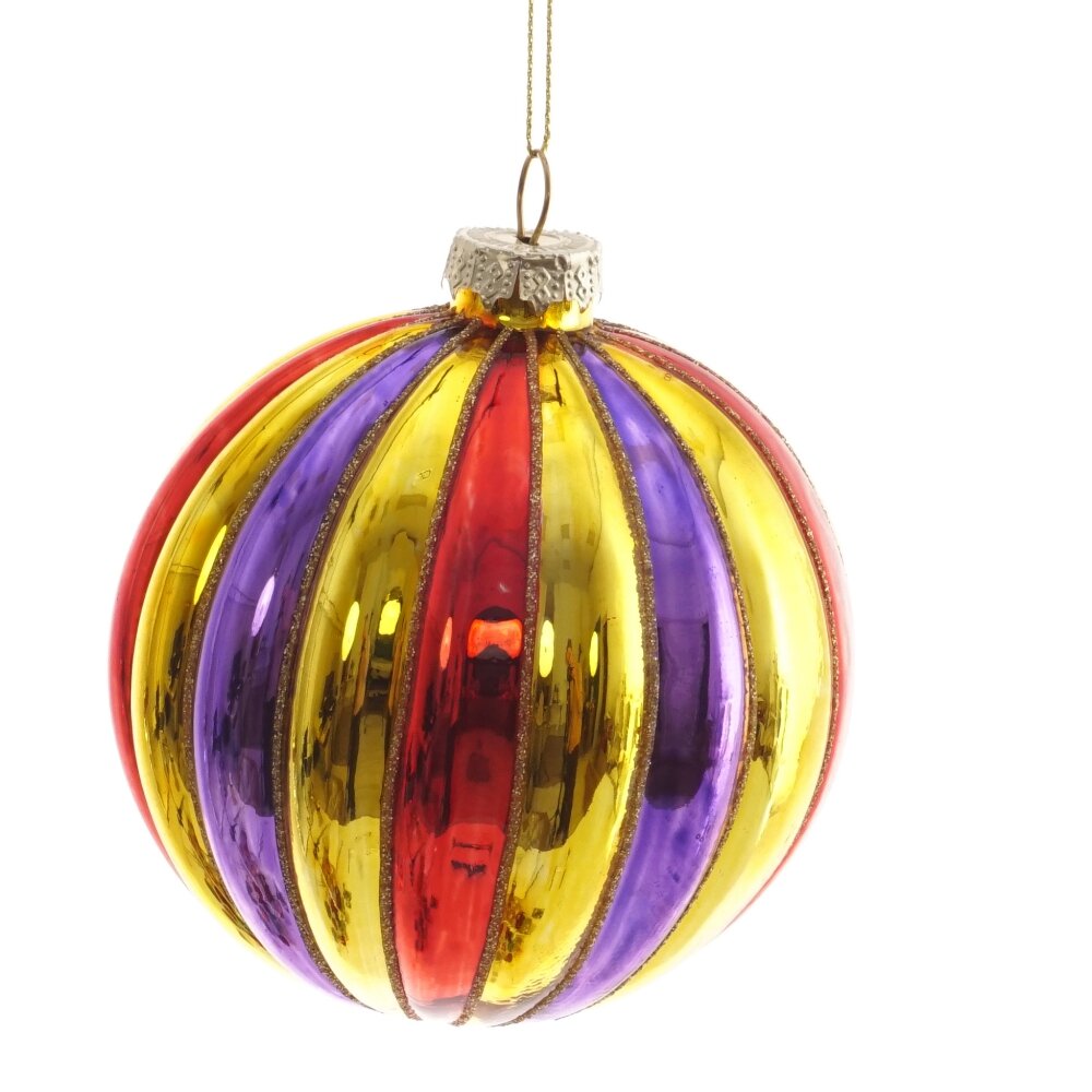 Новогоднее украшение Шар  изготовлено из тонкого и прочного стекла, что делает его легким и удобным для подвешивания на елку. Оно выполнено в ярких цветах - золотом, фиолетовом и красном, что  придает ему особую  красочность. Шар  будет прекрасно смотреться на елках любого стиля и подарит вам ощущение праздника и волшебства.