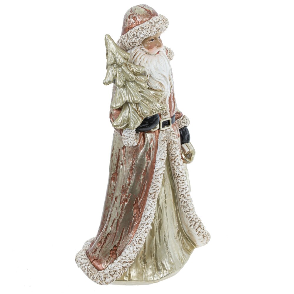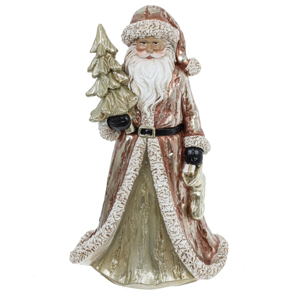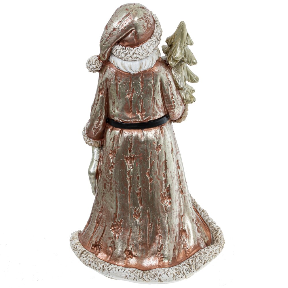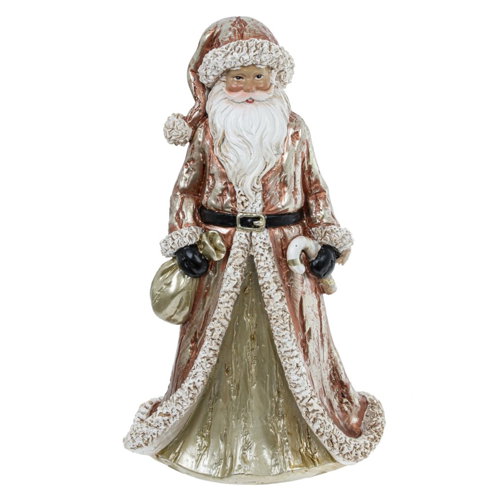 Эта сияющая статуэтка Дед Мороз из полистоуна замечательно подойдет в качестве новогоднего украшения или подарка. Выполнена в двух вариантах: с мешком подарков или елочкой. Розово-золотая гамма придает изделию элегантность и изысканность, что делает его прекрасным дополнением к новогоднему интерьеру.