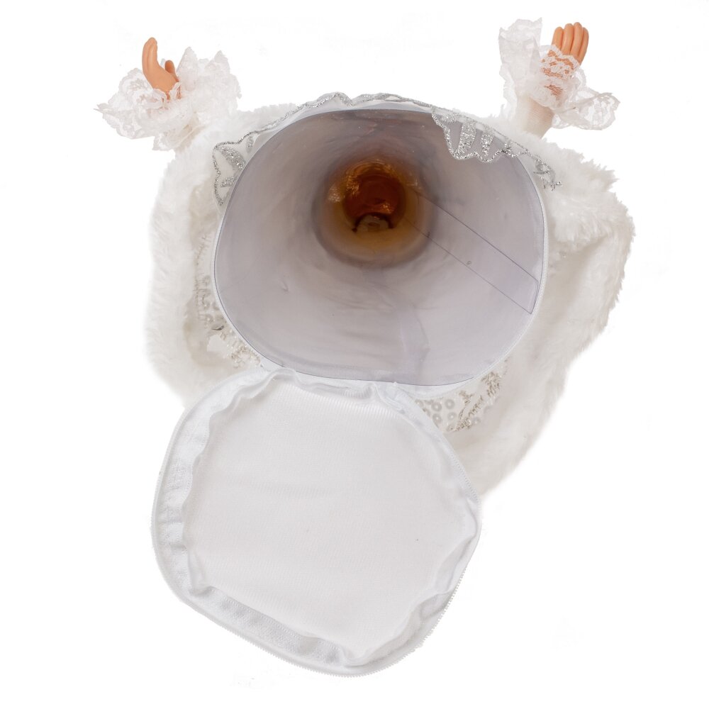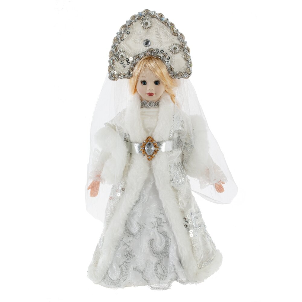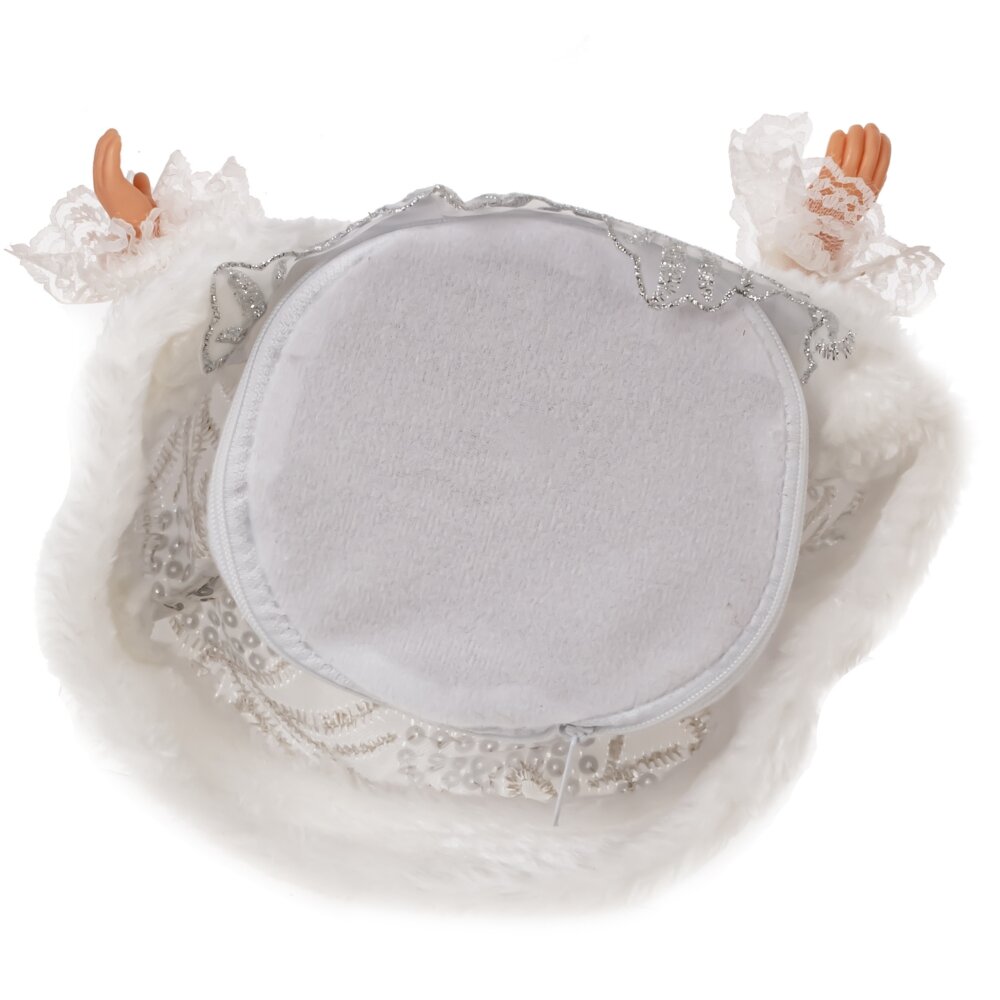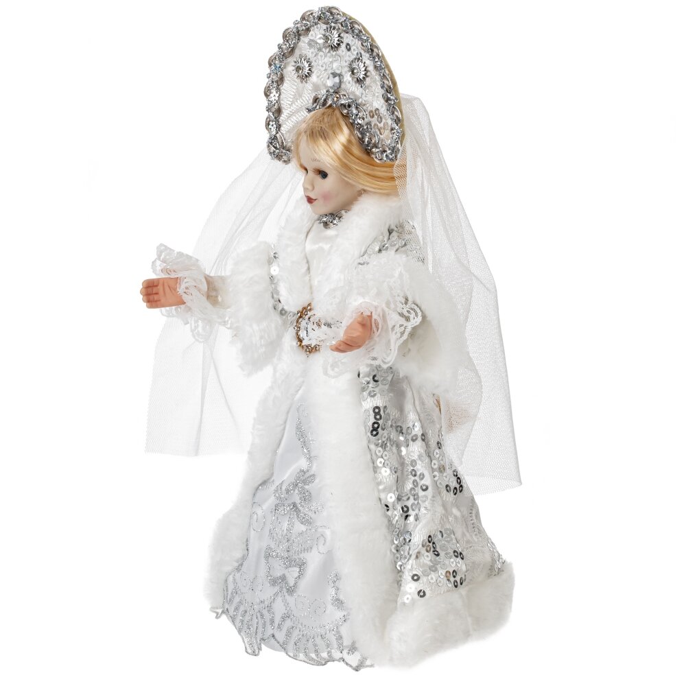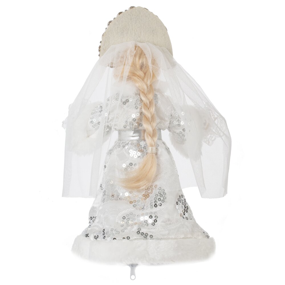 Снегурочка, с ёмкостью для конфет, l19 w13 h35 см. Материал: Полимерные материалы/Текстиль Снегурочка с ёмкостью для конфет — это невероятно красивая декоративная кукла высотой 35 см. Её изящное лицо и кисти рук выполнены из полимерных материалов. Она облачена в роскошный белый наряд с меховой отделкой, украшенной серебристыми деталями. На голове Снегурочки кокошник с фатой, а длинная светлая коса добавляет её образу очарования. Под платьем находится ёмкость для конфет, что делает эту куклу прекрасным подарком для маленьких и больших любителей сладостей. Вес, кг: 0. 22