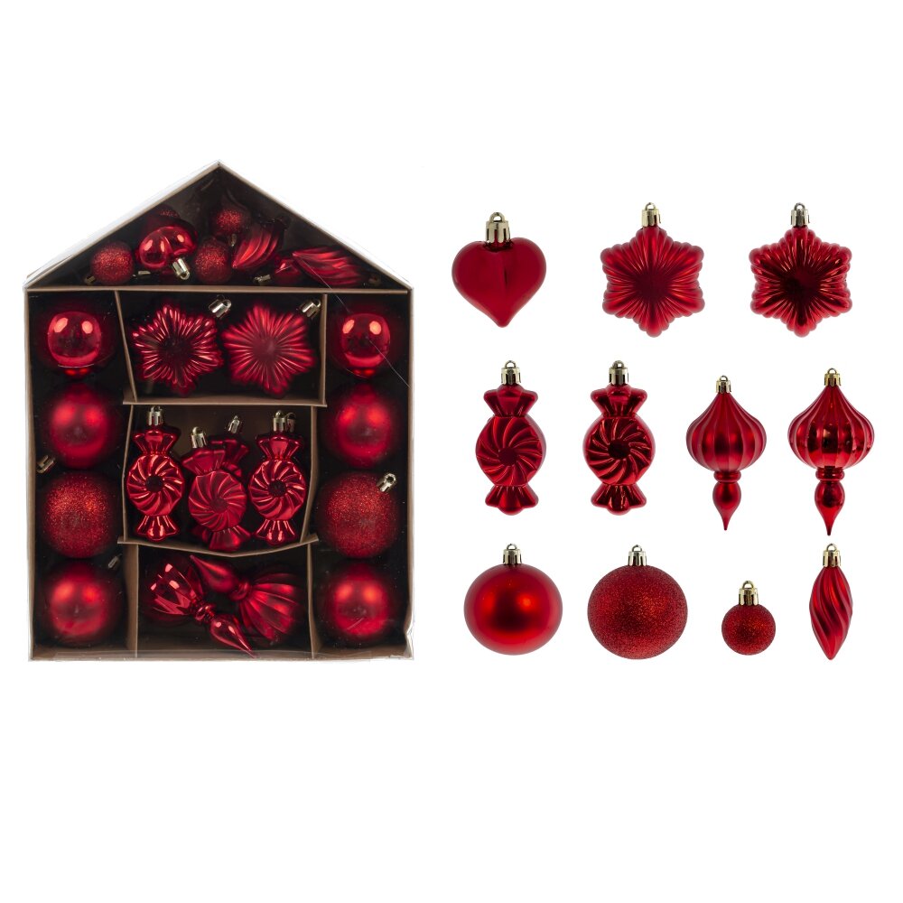 Набор из 32шт украшение новогоднее шар, l24 w6 h32 см. Материал: Полимерные материалы Набор из 32 елочных украшений в красном цвете в подарочной коробке в форме домика с прозрачной крышкой. Набор состоит из: шар D6 см - 8 шт; шар D3 cм - 6 шт; конфета L3 W2,5 H8,5 см - 6 шт; звезда L6 W3 Н7 см - 4 шт; спираль L3 W3 H7 см - 3 ш т; сердце L4 W2,5 H5 см - 3 шт; Сосулька фигурная L6 W6 H12 см - 2 шт. Всего 32 новогодних украшения в едином стиле. Каждое украшение в наборе выполнено из прочного и легкого полимерного материала, что делает его удобным для подвешивания на елку. Глиттер, рассыпанный по поверхности украшений, придает им особый блеск и изящество, словно они покрыты искрящимся инеем. Вес, кг: 0. 285