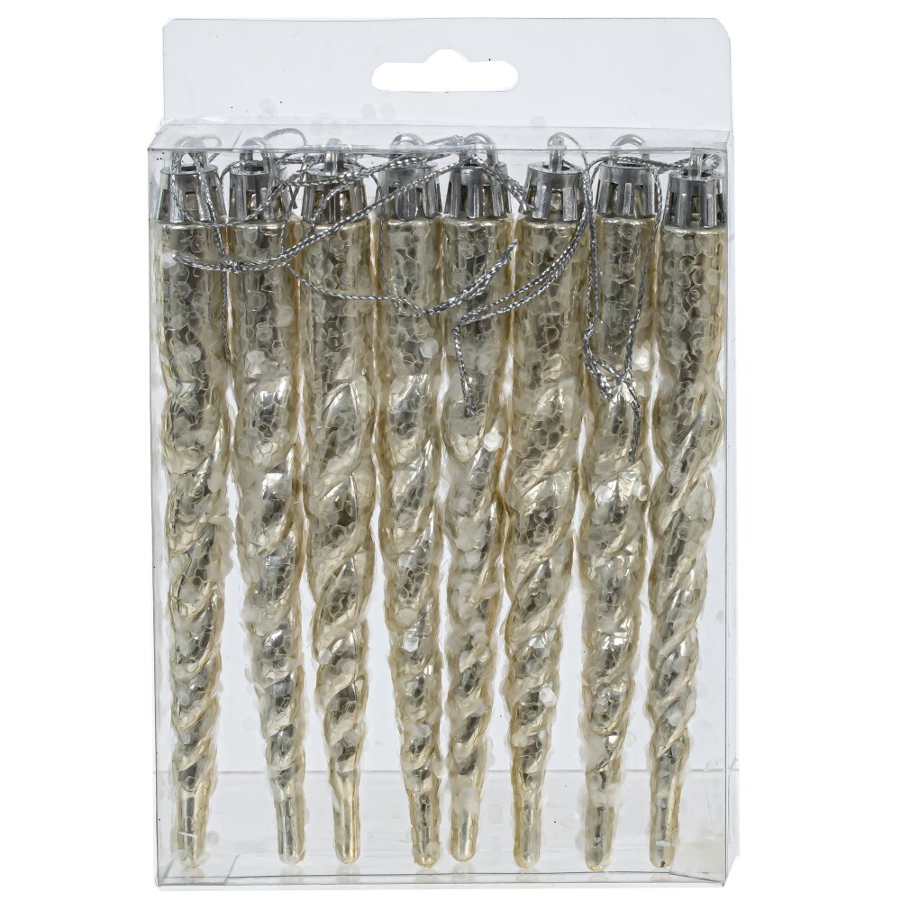 Набор из 8шт украшение новогоднее сосулька, l10 w1,5 h15 см. Материал: Полимерные материалы Набор из 8 серебристых сосулек (13см), закрученных спиралью, подойдет для новогоднего украшения. Размер упаковки набора со сосульками составляет 10х1,5х15 см. Эти стильные декоративные элементы, присыпанные снежным глиттером, придадут вашей елке изысканности и праздничного настроения, внося свою неповторимую нотку в обстановку. Вес, кг: 0. 045